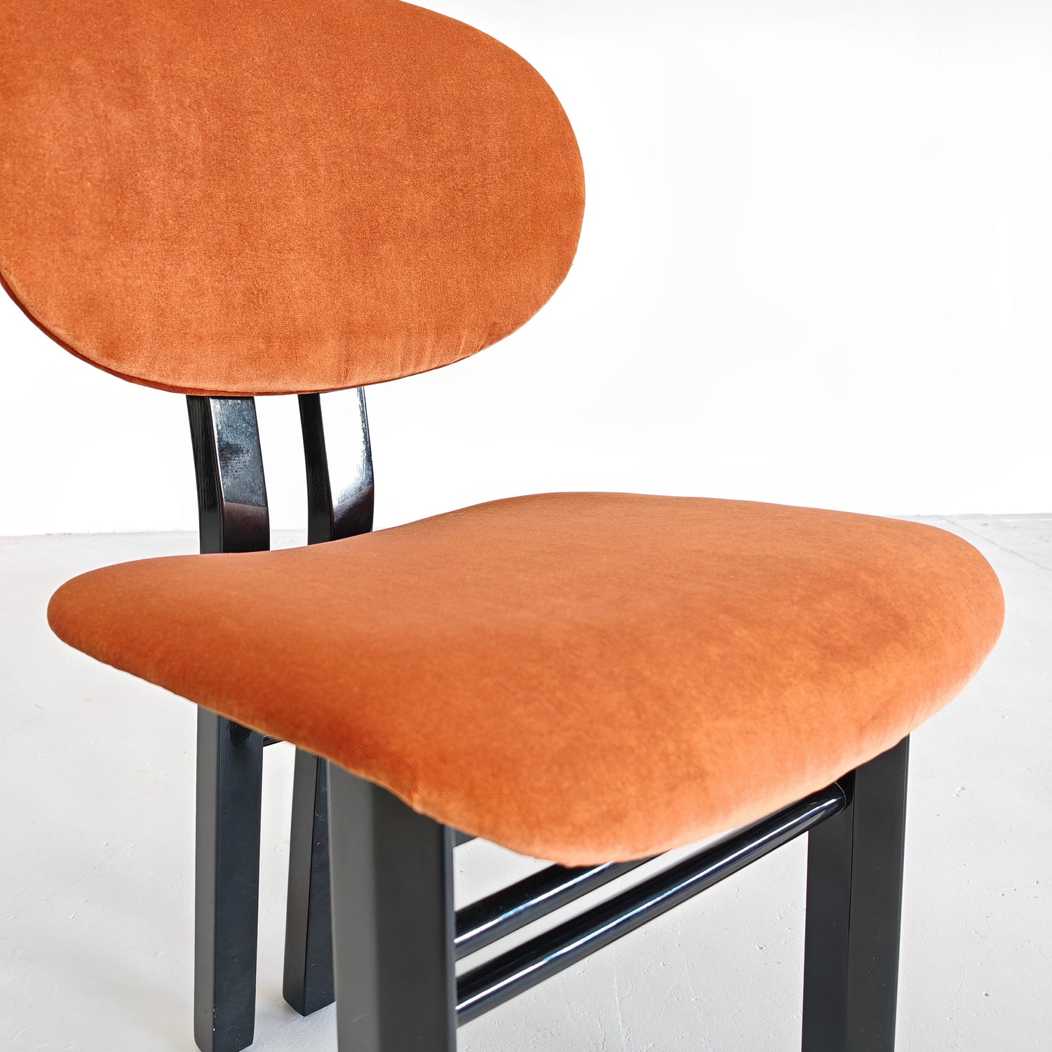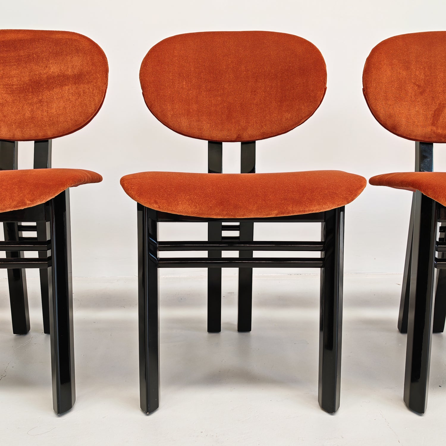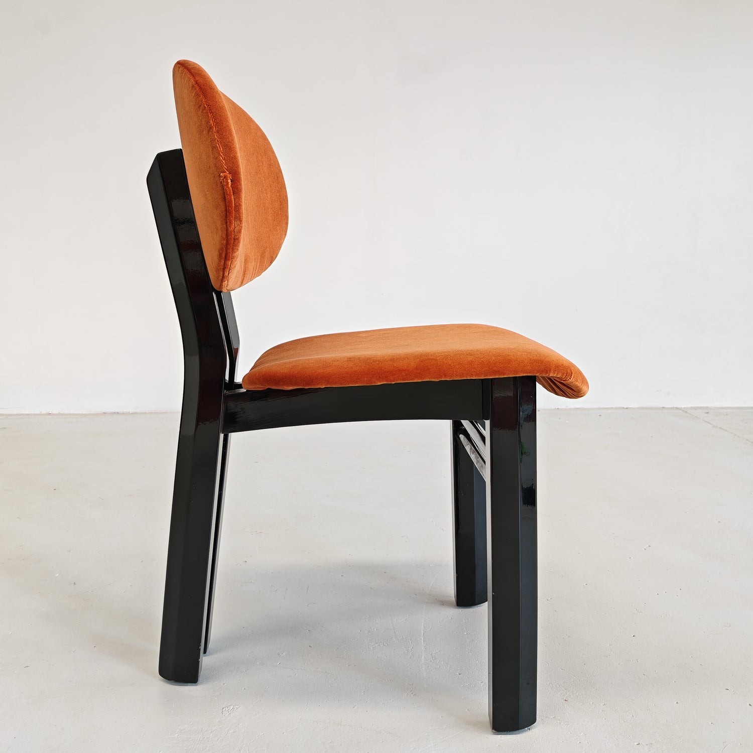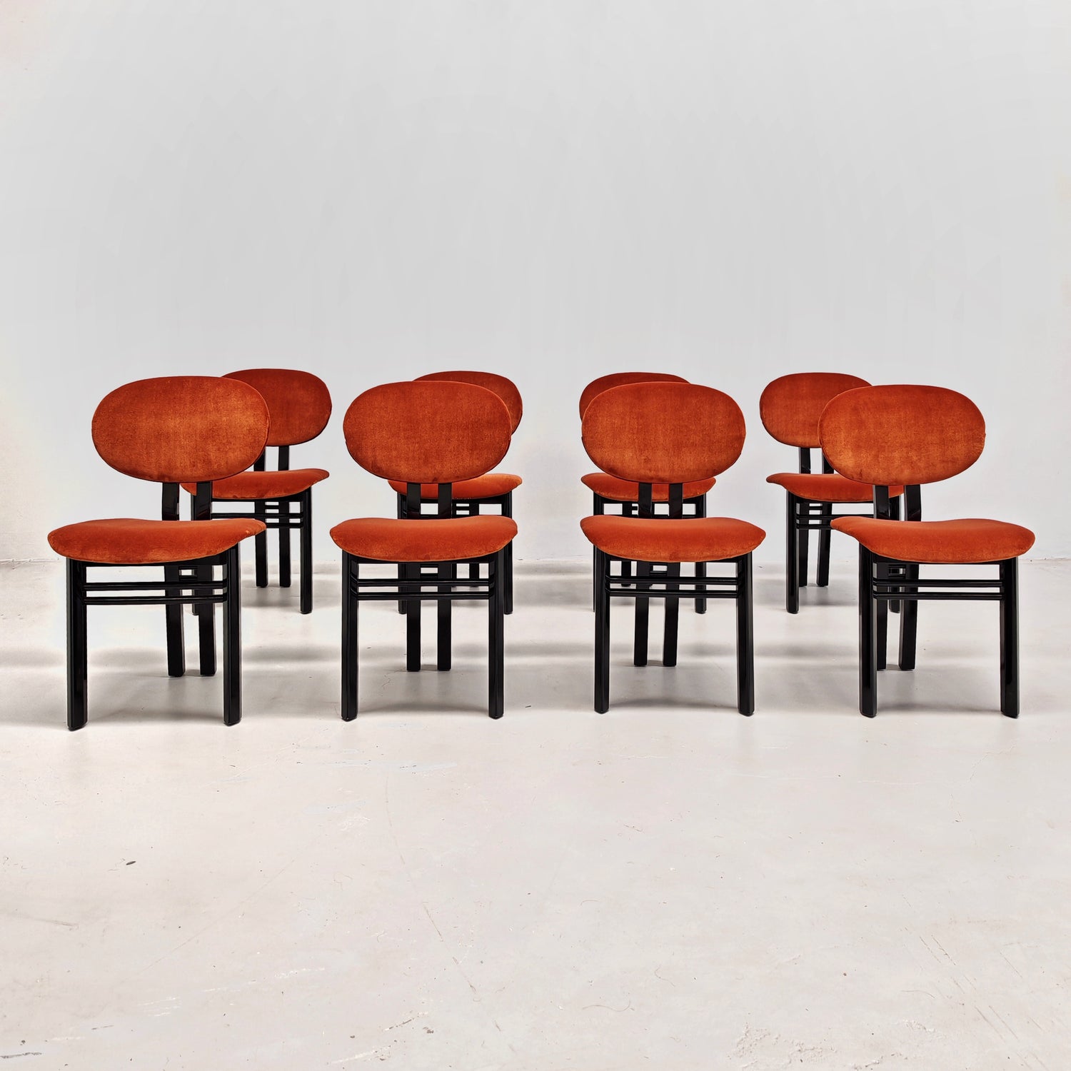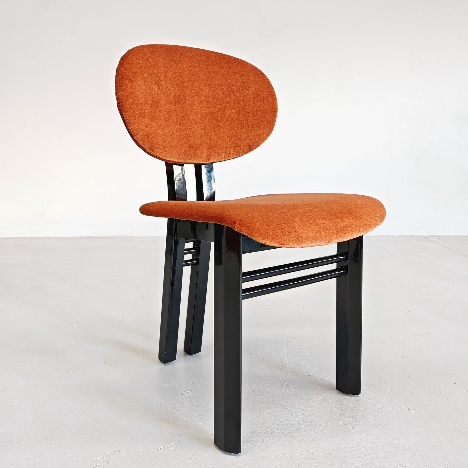 La sedia MED è stata realizzata nel 1983 da Giotto Stoppino e Lodovico Acerbis per Acerbis. Si caratterizza per il suo contrasto tra curve e linearità, come la particolare sezione delle gambe, che ricorda il Flatiron Building di Manhattan, e le rotondità di schienale e seduta realizzate in multistrato curvato. Nel 2022 Acerbis le ha riproposte nella collezione Remasters, questo set invece appartiene alla produzione originale anni 80 e si distingue per la laccatura in poliestere nero lucido rispetto alle finiture opache delle produzioni recenti. Il rivestimento e l'imbottitura sono stati rinnovati applicando spugne nuove e un velluto top quality color ruggine.