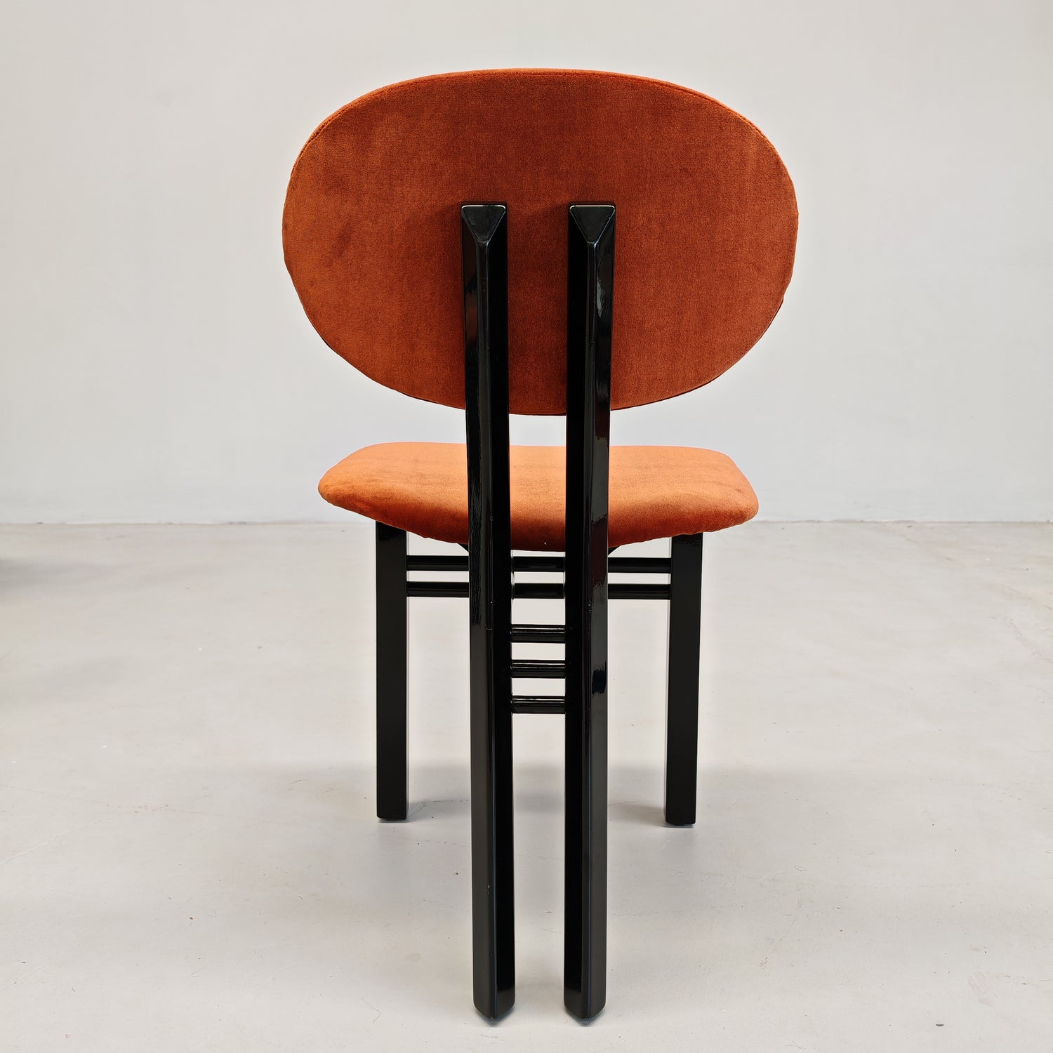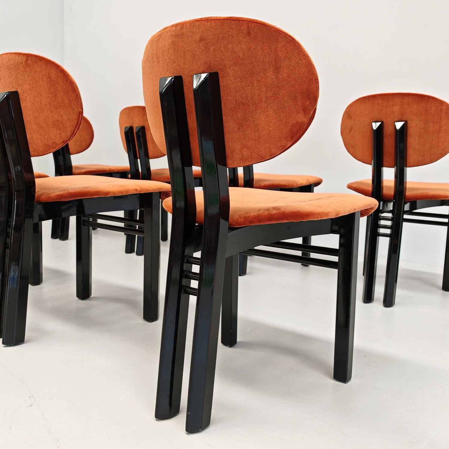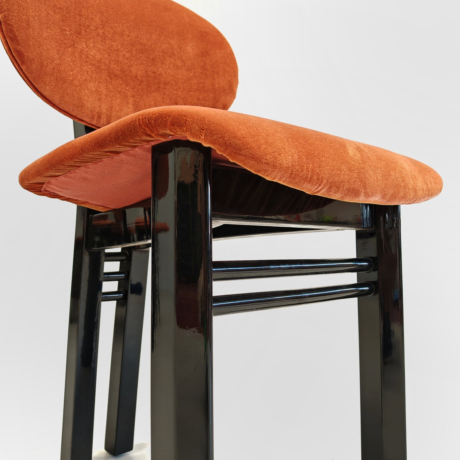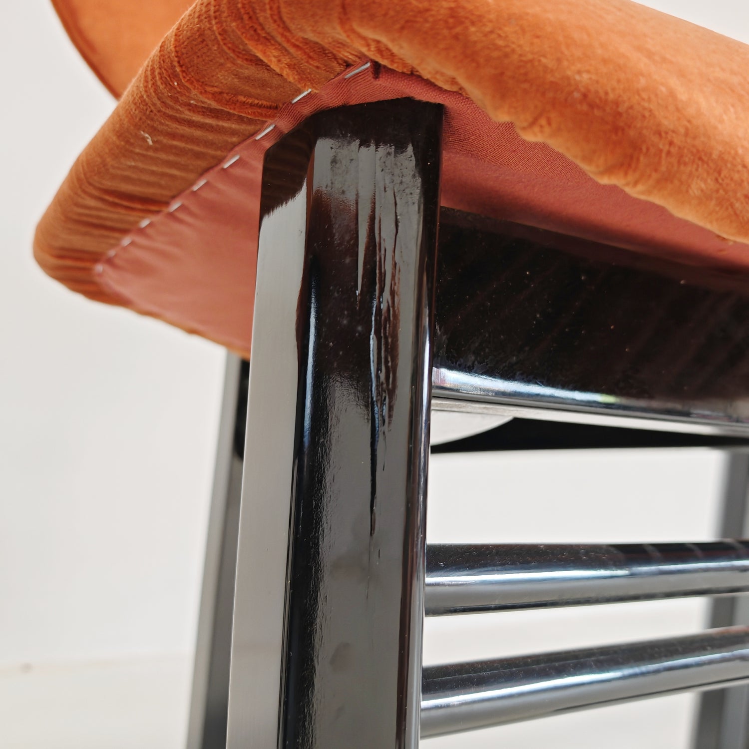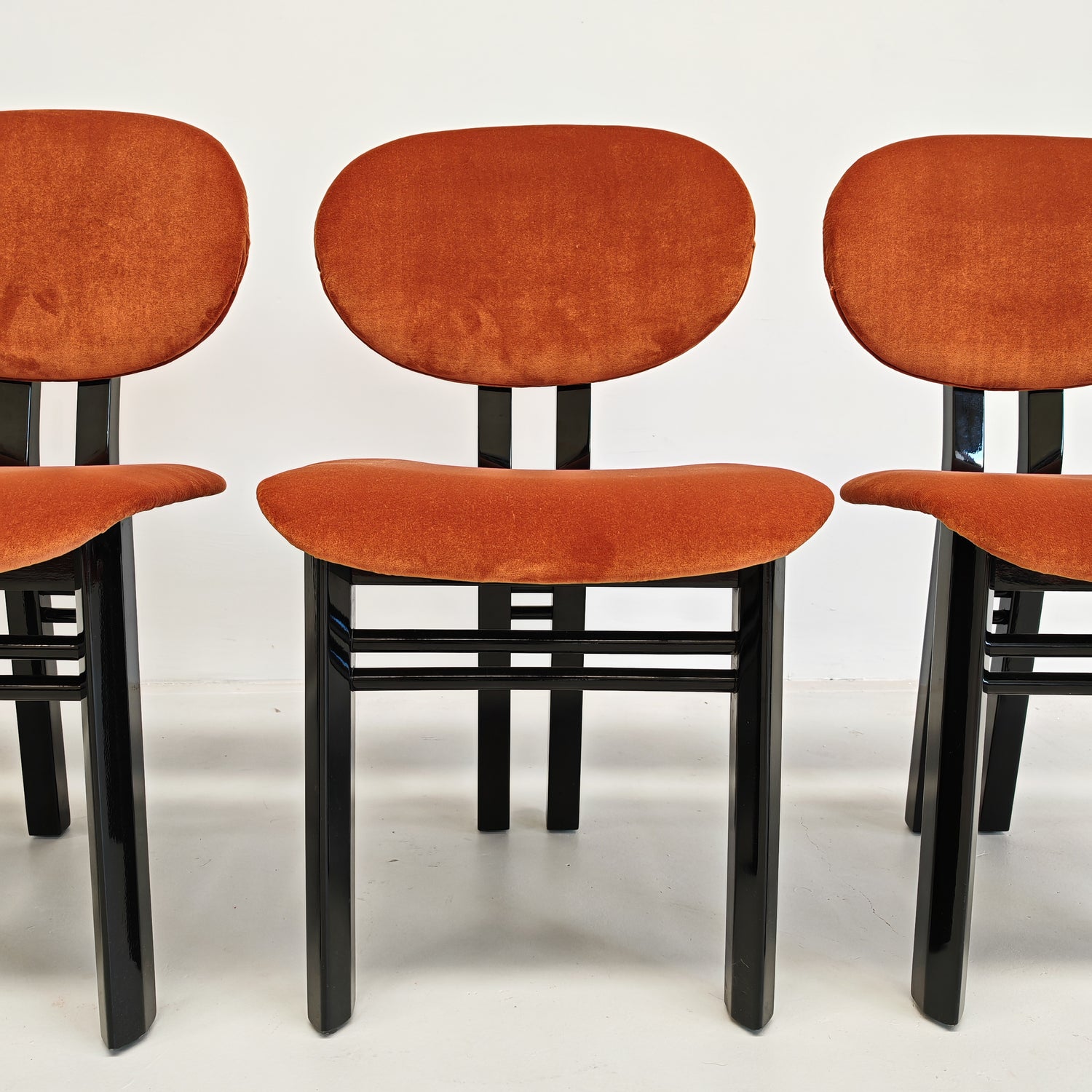 La sedia MED è stata realizzata nel 1983 da Giotto Stoppino e Lodovico Acerbis per Acerbis. Si caratterizza per il suo contrasto tra curve e linearità, come la particolare sezione delle gambe, che ricorda il Flatiron Building di Manhattan, e le rotondità di schienale e seduta realizzate in multistrato curvato. Nel 2022 Acerbis le ha riproposte nella collezione Remasters, questo set invece appartiene alla produzione originale anni 80 e si distingue per la laccatura in poliestere nero lucido rispetto alle finiture opache delle produzioni recenti. Il rivestimento e l'imbottitura sono stati rinnovati applicando spugne nuove e un velluto top quality color ruggine.