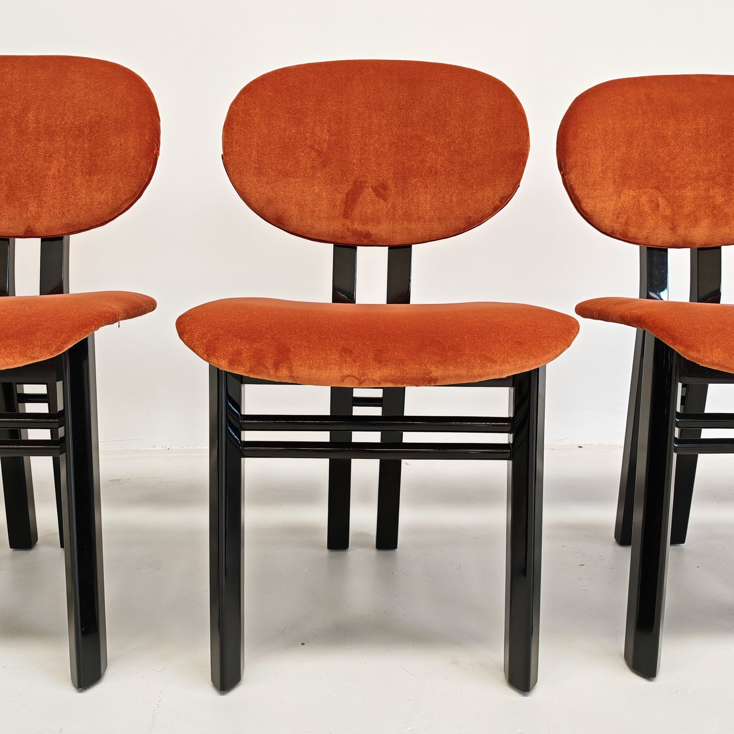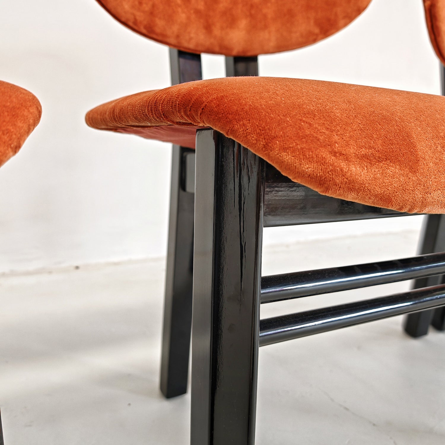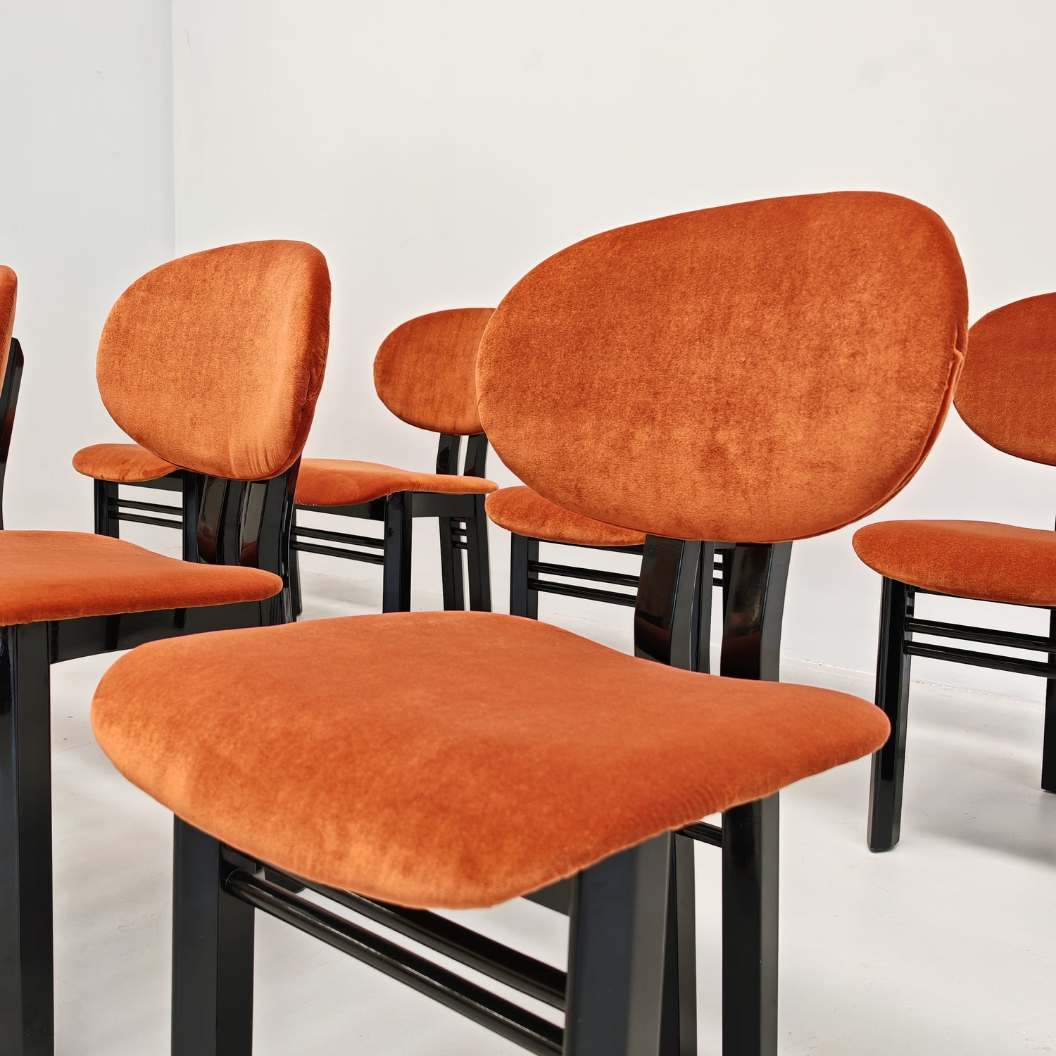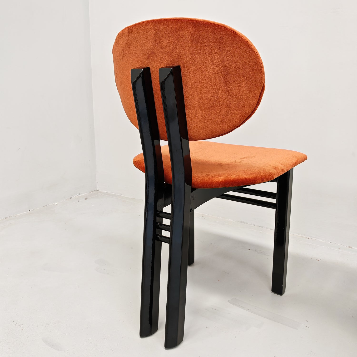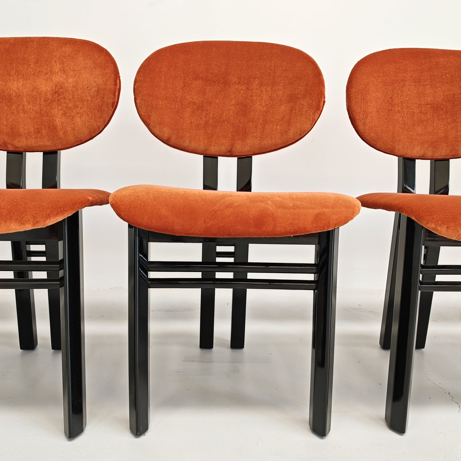 La sedia MED è stata realizzata nel 1983 da Giotto Stoppino e Lodovico Acerbis per Acerbis. Si caratterizza per il suo contrasto tra curve e linearità, come la particolare sezione delle gambe, che ricorda il Flatiron Building di Manhattan, e le rotondità di schienale e seduta realizzate in multistrato curvato. Nel 2022 Acerbis le ha riproposte nella collezione Remasters, questo set invece appartiene alla produzione originale anni 80 e si distingue per la laccatura in poliestere nero lucido rispetto alle finiture opache delle produzioni recenti. Il rivestimento e l'imbottitura sono stati rinnovati applicando spugne nuove e un velluto top quality color ruggine.