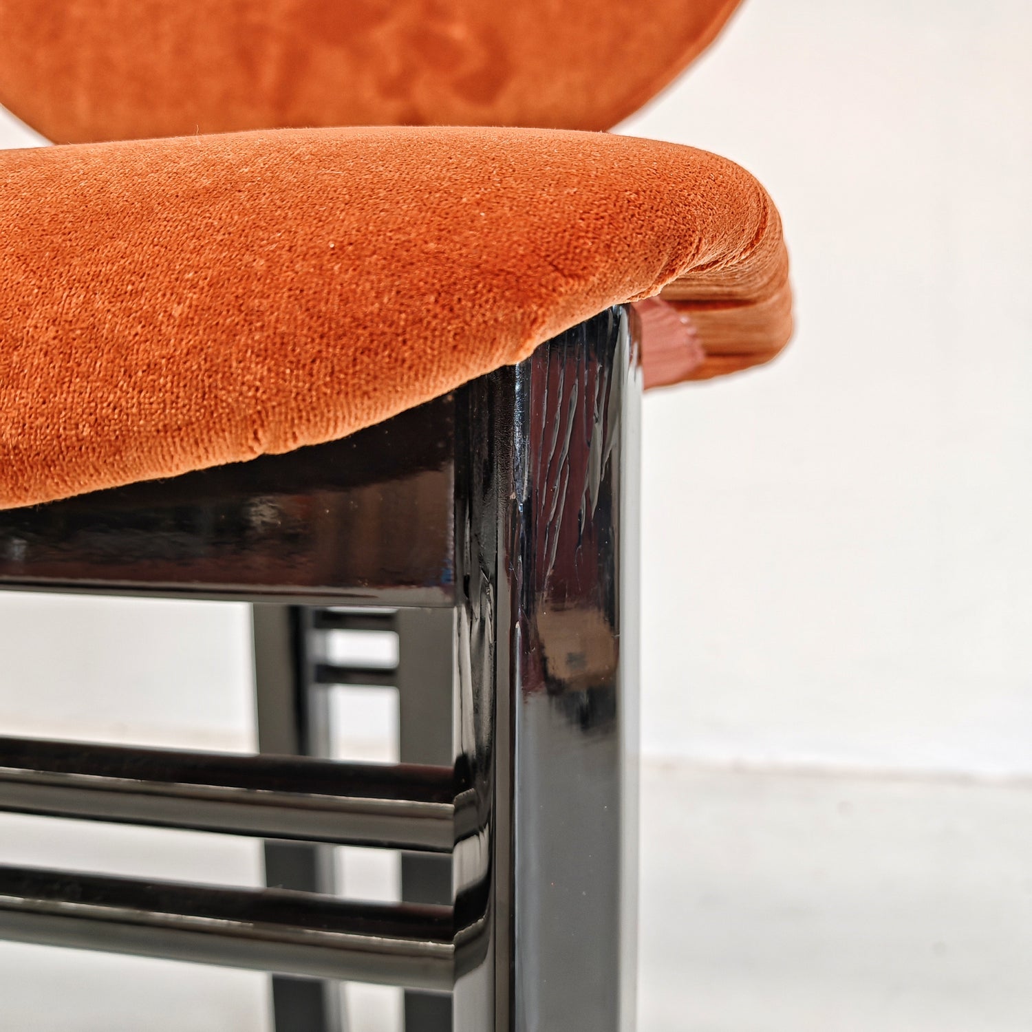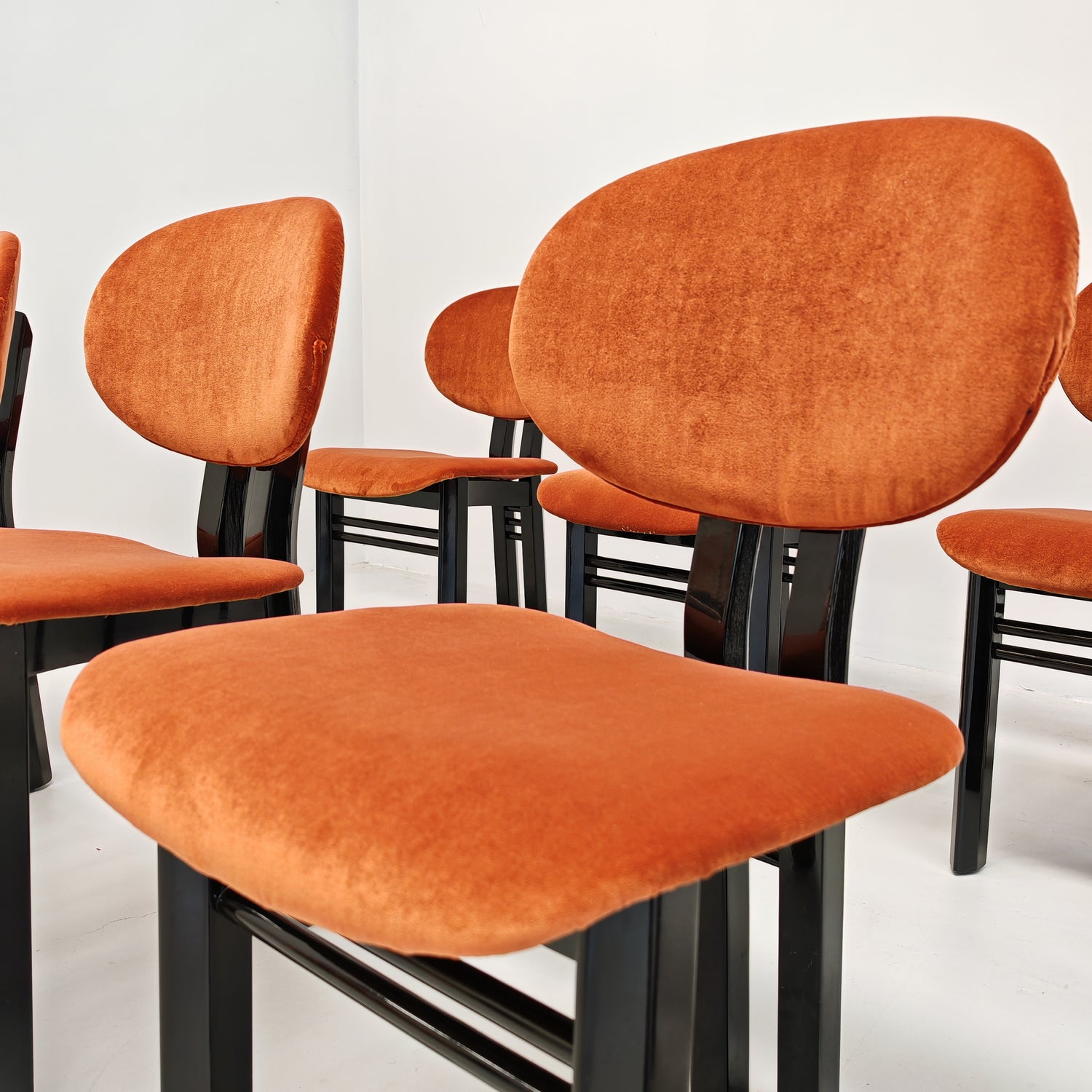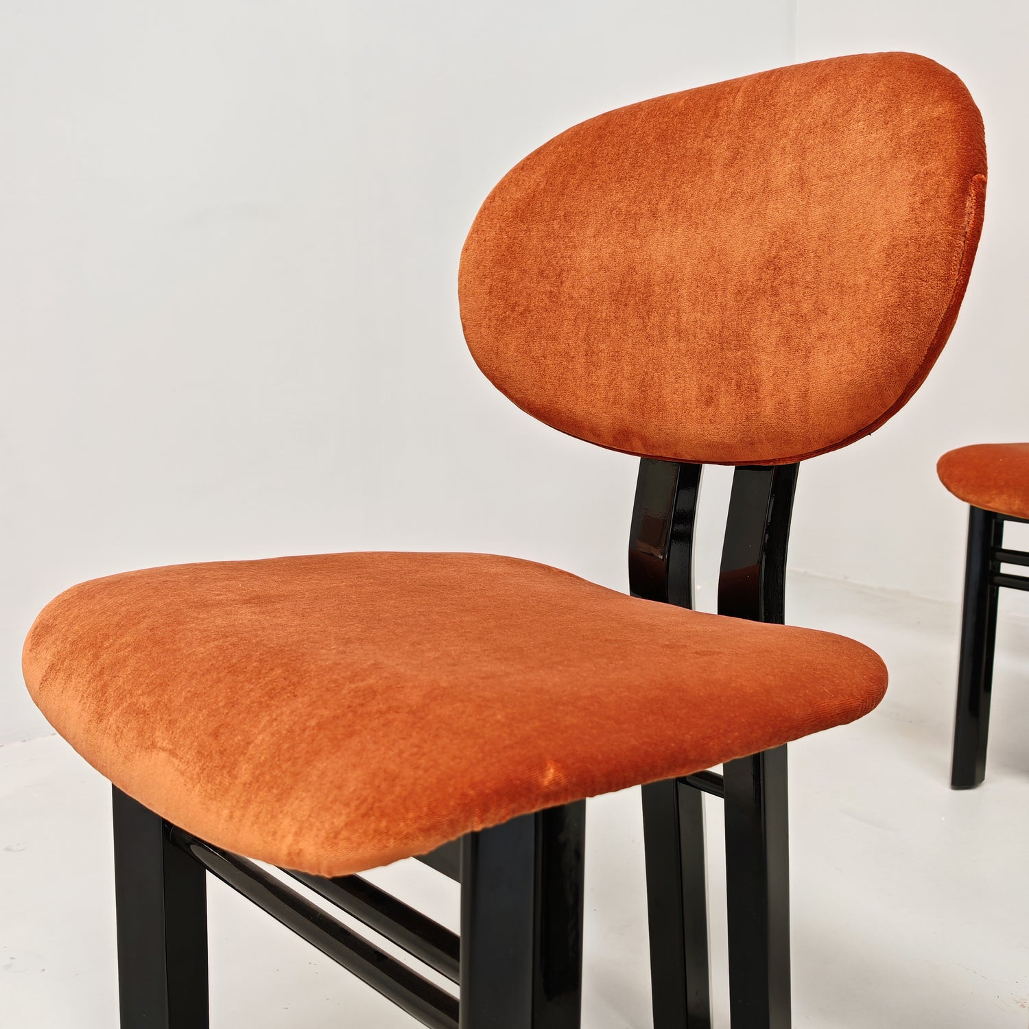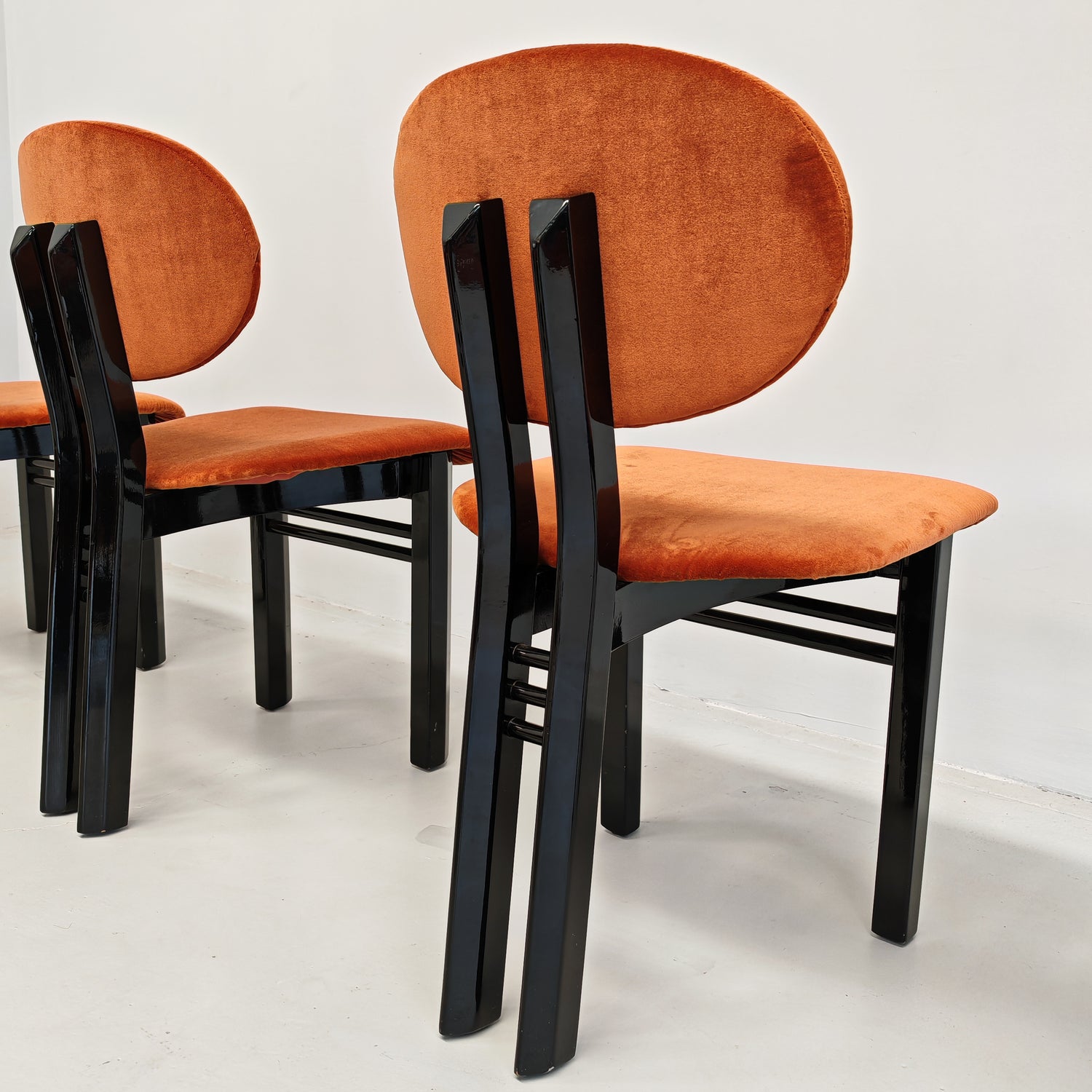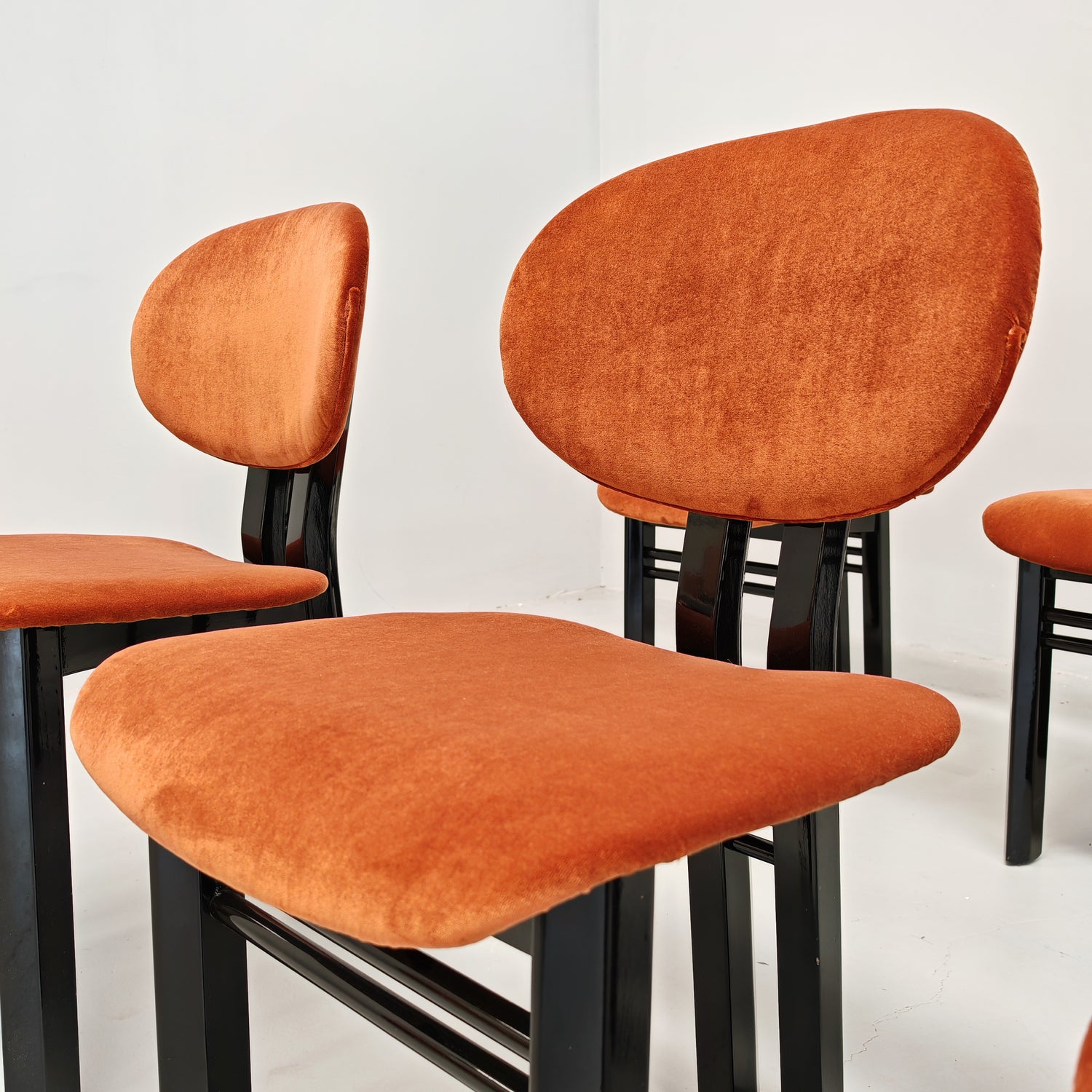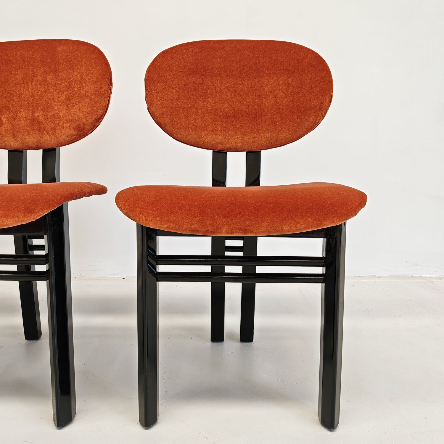 La sedia MED è stata realizzata nel 1983 da Giotto Stoppino e Lodovico Acerbis per Acerbis. Si caratterizza per il suo contrasto tra curve e linearità, come la particolare sezione delle gambe, che ricorda il Flatiron Building di Manhattan, e le rotondità di schienale e seduta realizzate in multistrato curvato. Nel 2022 Acerbis le ha riproposte nella collezione Remasters, questo set invece appartiene alla produzione originale anni 80 e si distingue per la laccatura in poliestere nero lucido rispetto alle finiture opache delle produzioni recenti. Il rivestimento e l'imbottitura sono stati rinnovati applicando spugne nuove e un velluto top quality color ruggine.