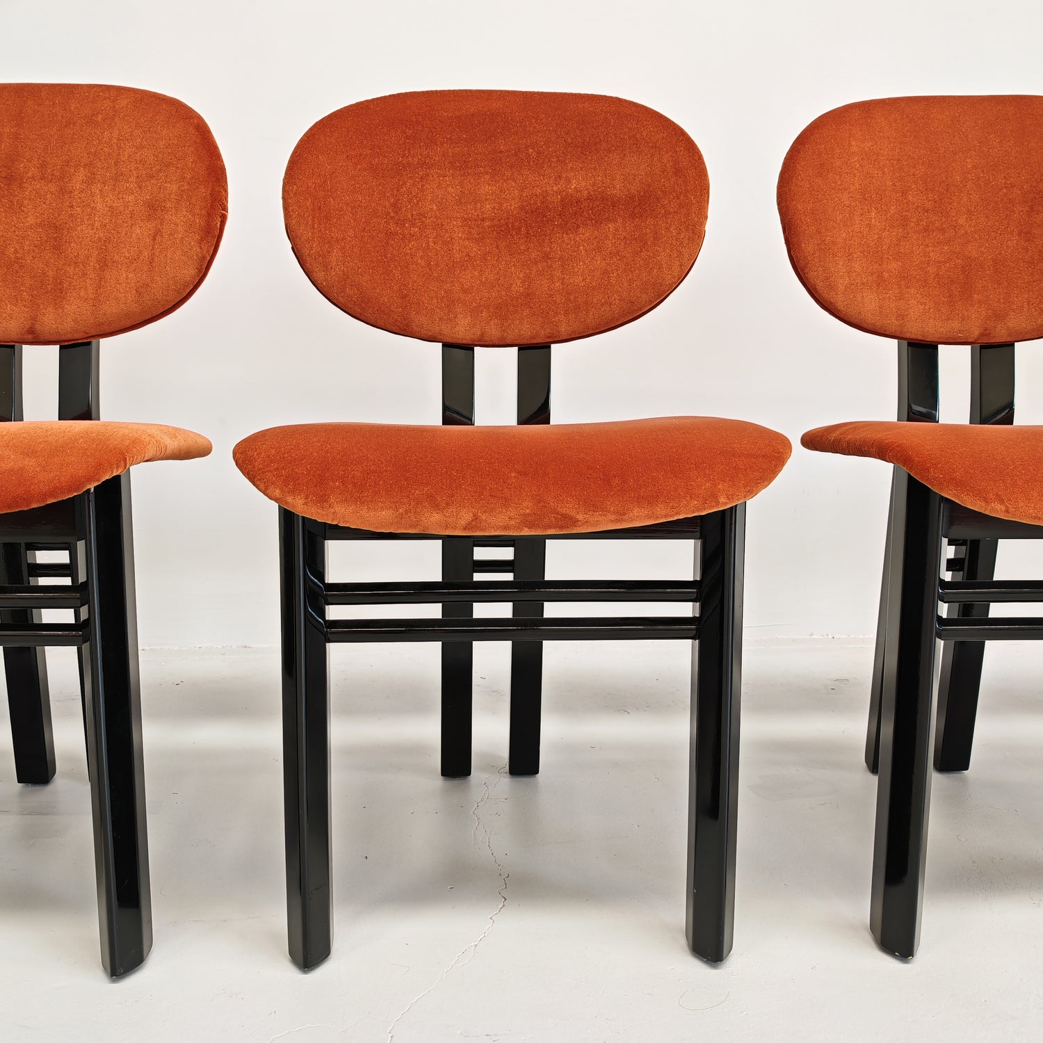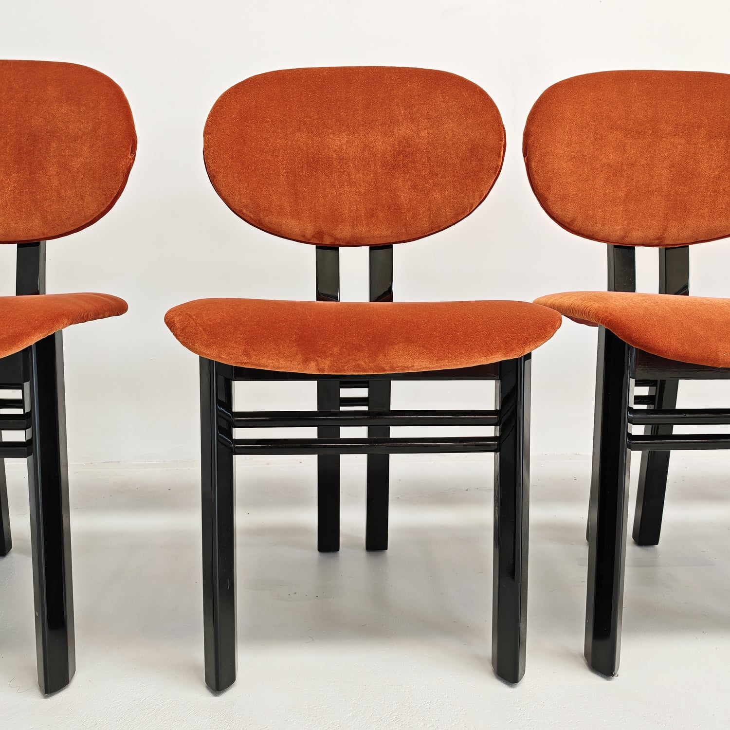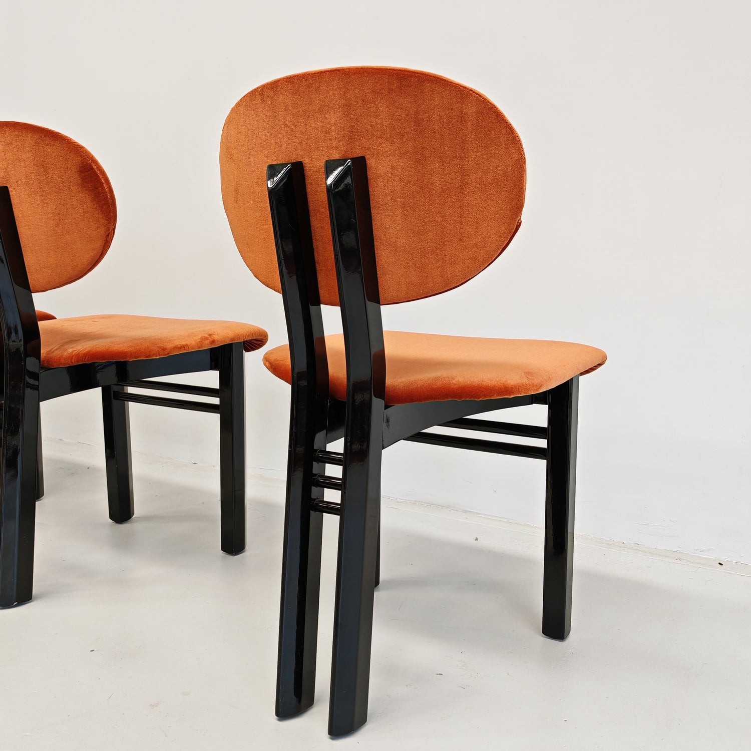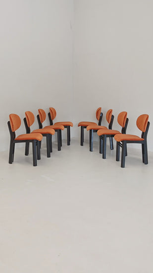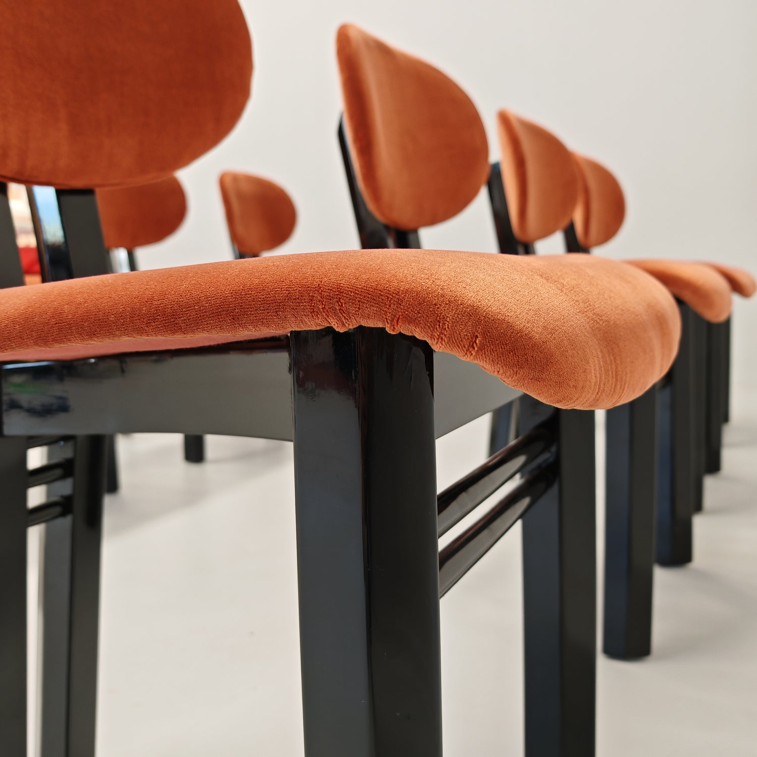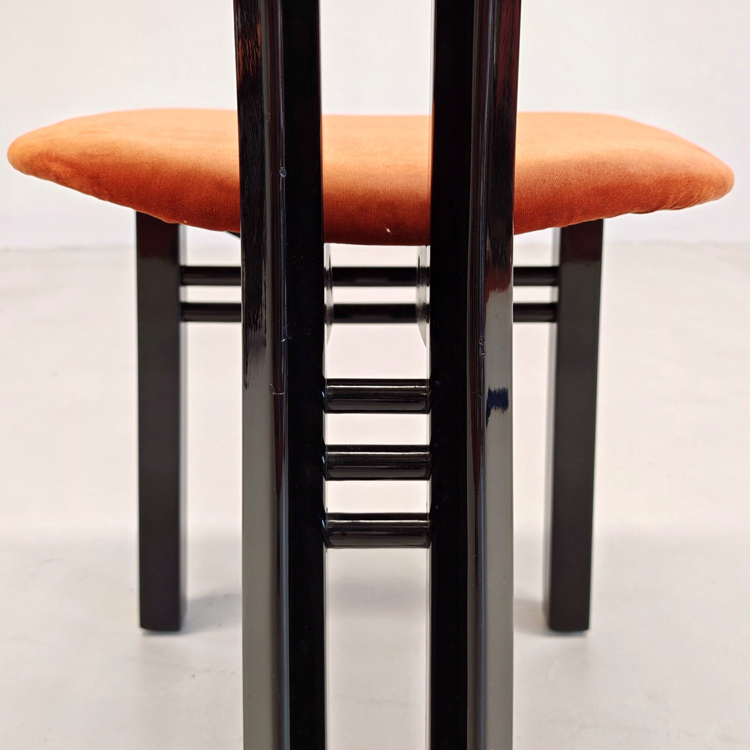 La sedia MED è stata realizzata nel 1983 da Giotto Stoppino e Lodovico Acerbis per Acerbis. Si caratterizza per il suo contrasto tra curve e linearità, come la particolare sezione delle gambe, che ricorda il Flatiron Building di Manhattan, e le rotondità di schienale e seduta realizzate in multistrato curvato. Nel 2022 Acerbis le ha riproposte nella collezione Remasters, questo set invece appartiene alla produzione originale anni 80 e si distingue per la laccatura in poliestere nero lucido rispetto alle finiture opache delle produzioni recenti. Il rivestimento e l'imbottitura sono stati rinnovati applicando spugne nuove e un velluto top quality color ruggine.