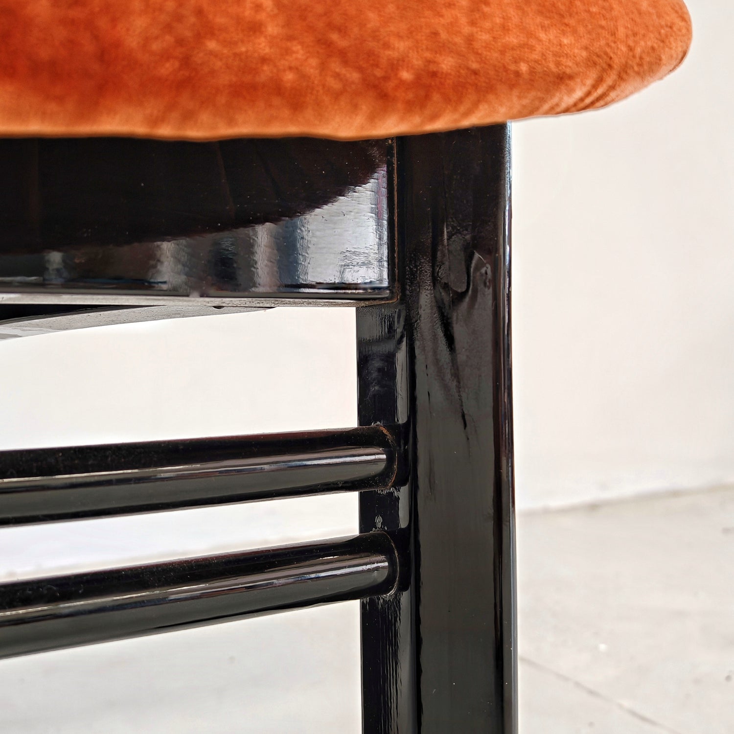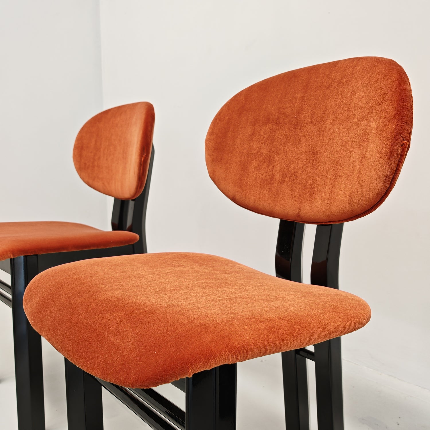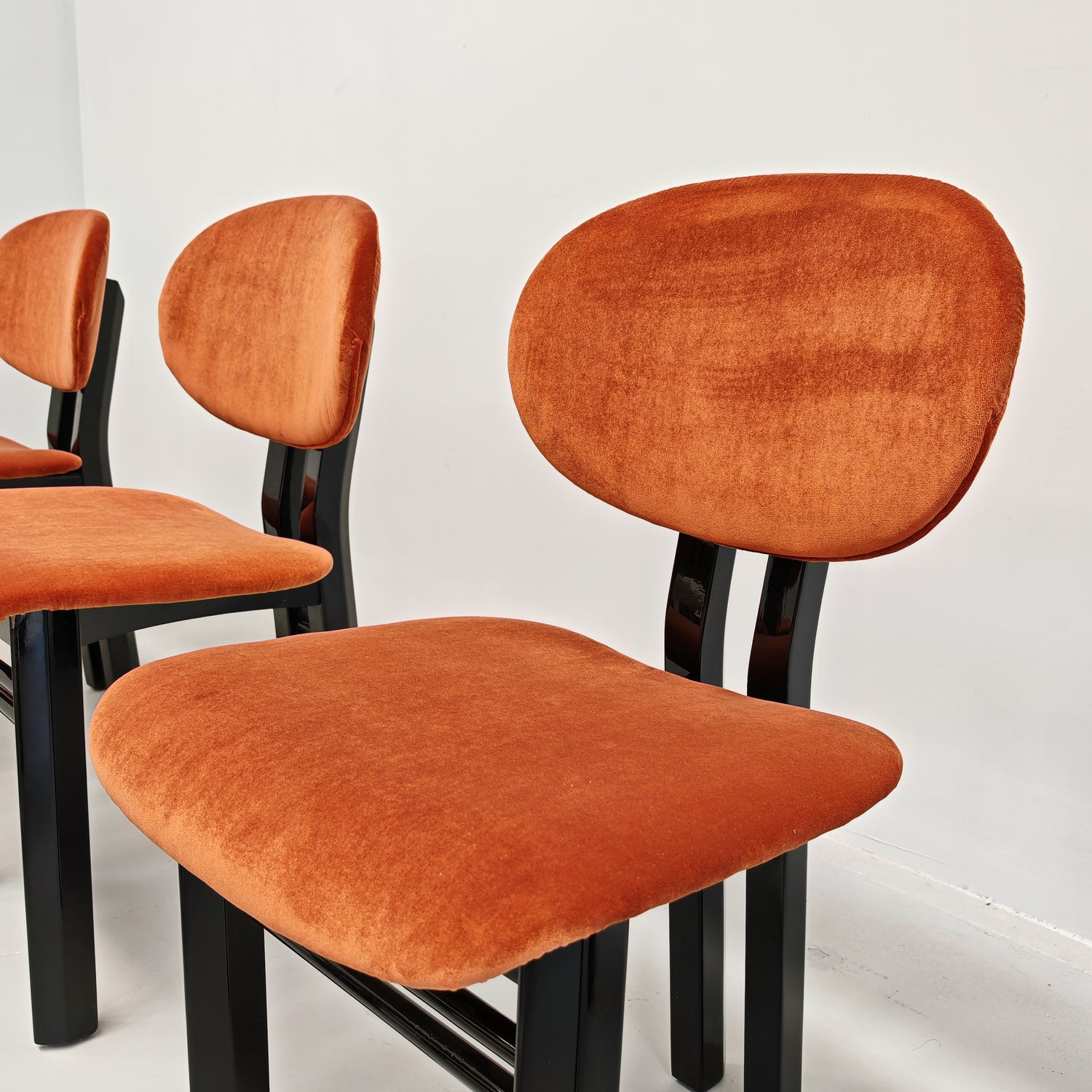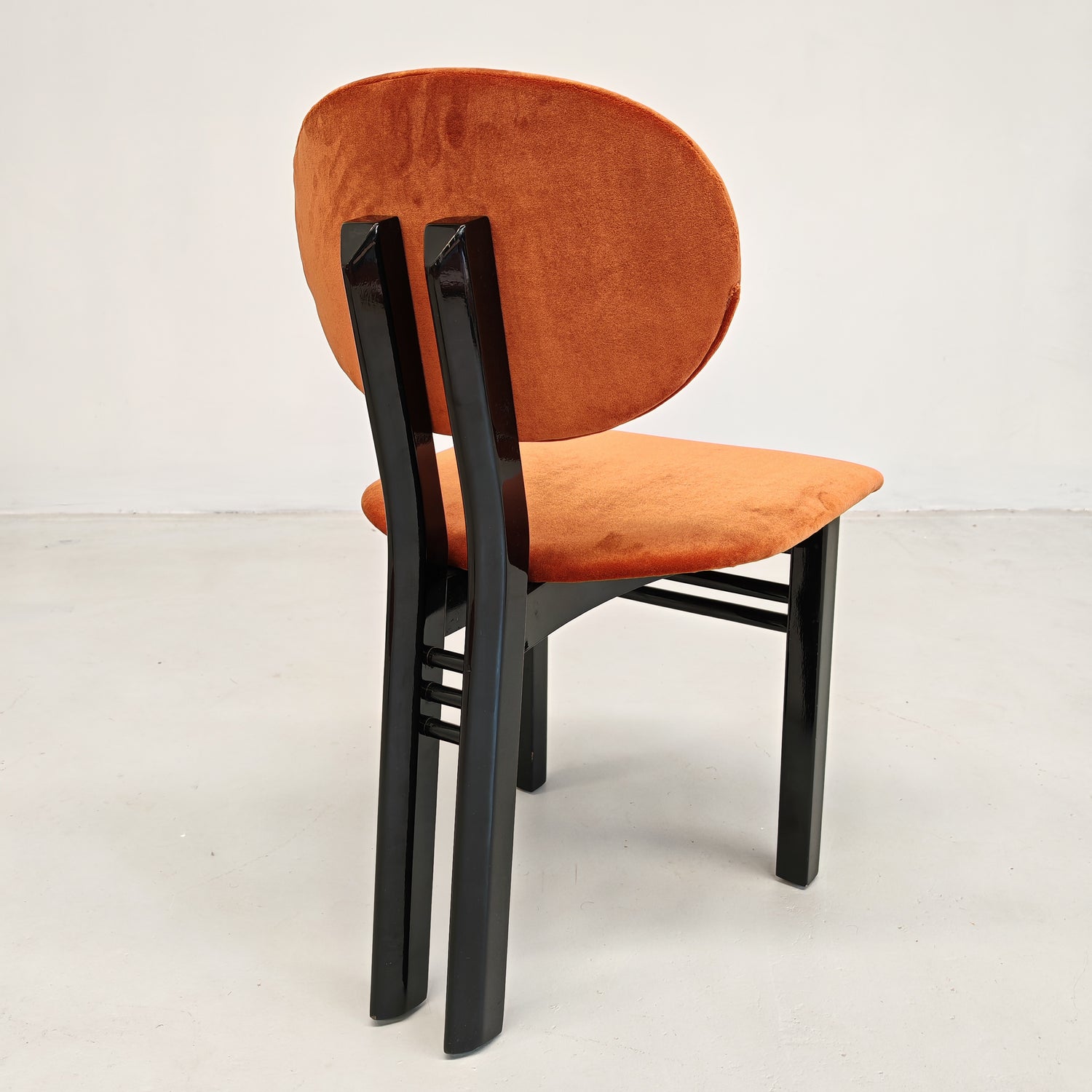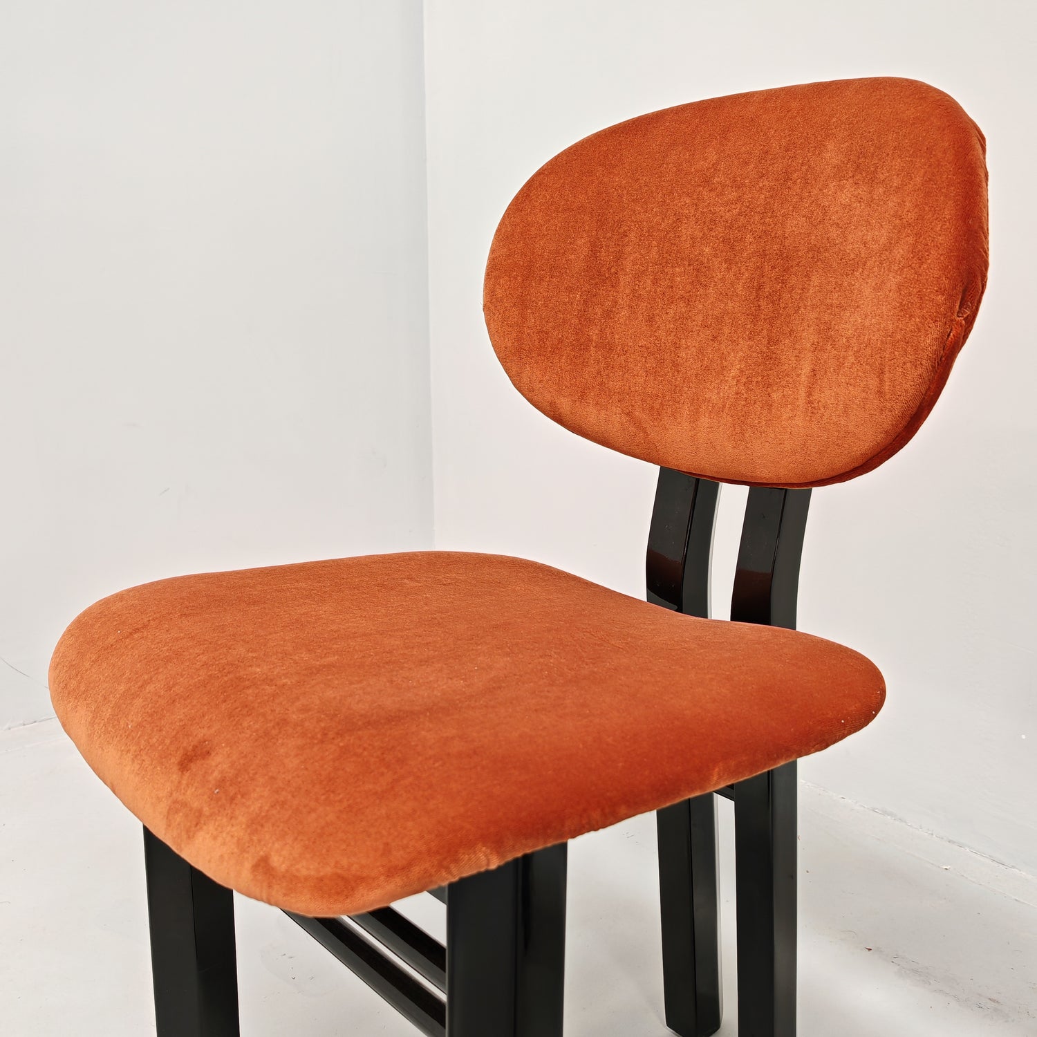 La sedia MED è stata realizzata nel 1983 da Giotto Stoppino e Lodovico Acerbis per Acerbis. Si caratterizza per il suo contrasto tra curve e linearità, come la particolare sezione delle gambe, che ricorda il Flatiron Building di Manhattan, e le rotondità di schienale e seduta realizzate in multistrato curvato. Nel 2022 Acerbis le ha riproposte nella collezione Remasters, questo set invece appartiene alla produzione originale anni 80 e si distingue per la laccatura in poliestere nero lucido rispetto alle finiture opache delle produzioni recenti. Il rivestimento e l'imbottitura sono stati rinnovati applicando spugne nuove e un velluto top quality color ruggine.