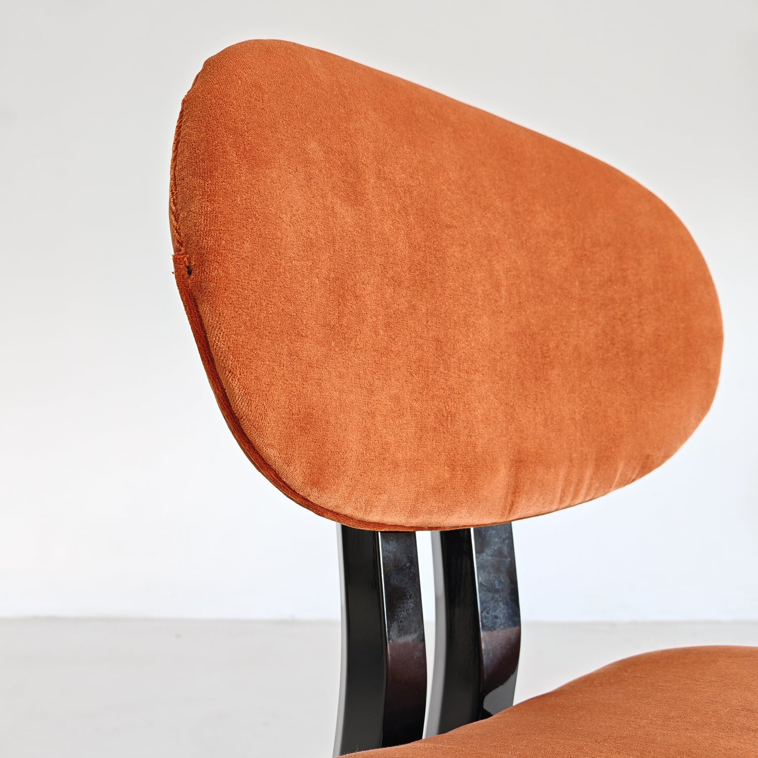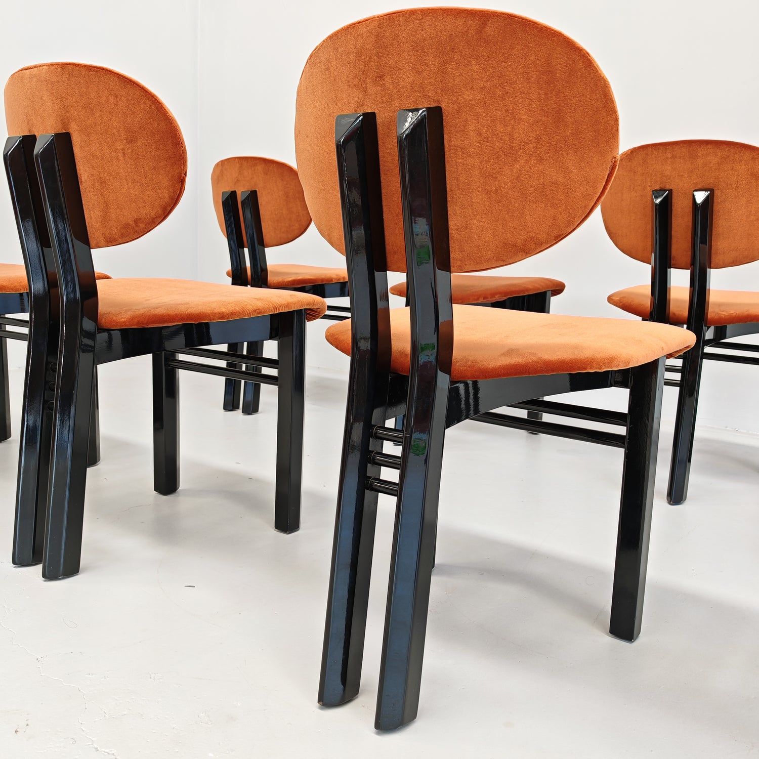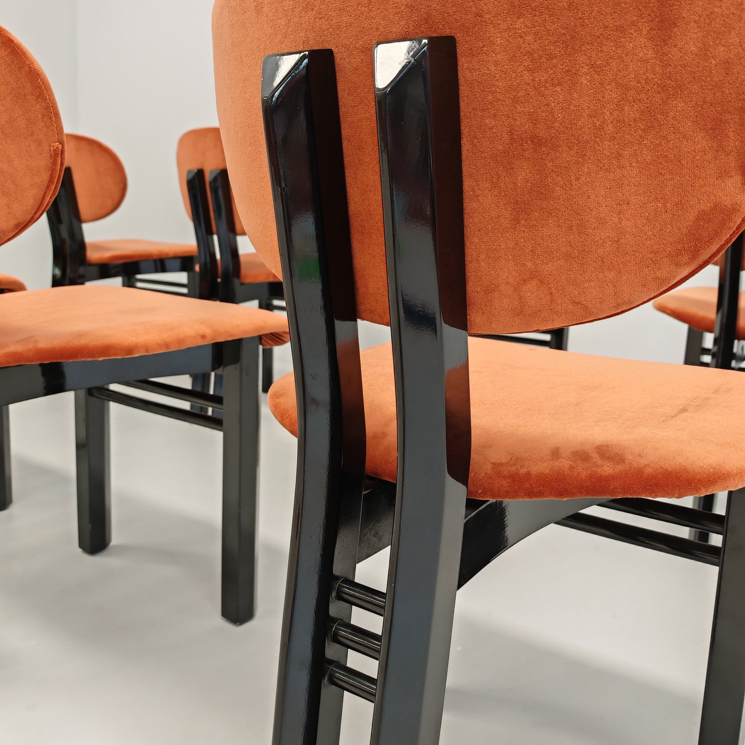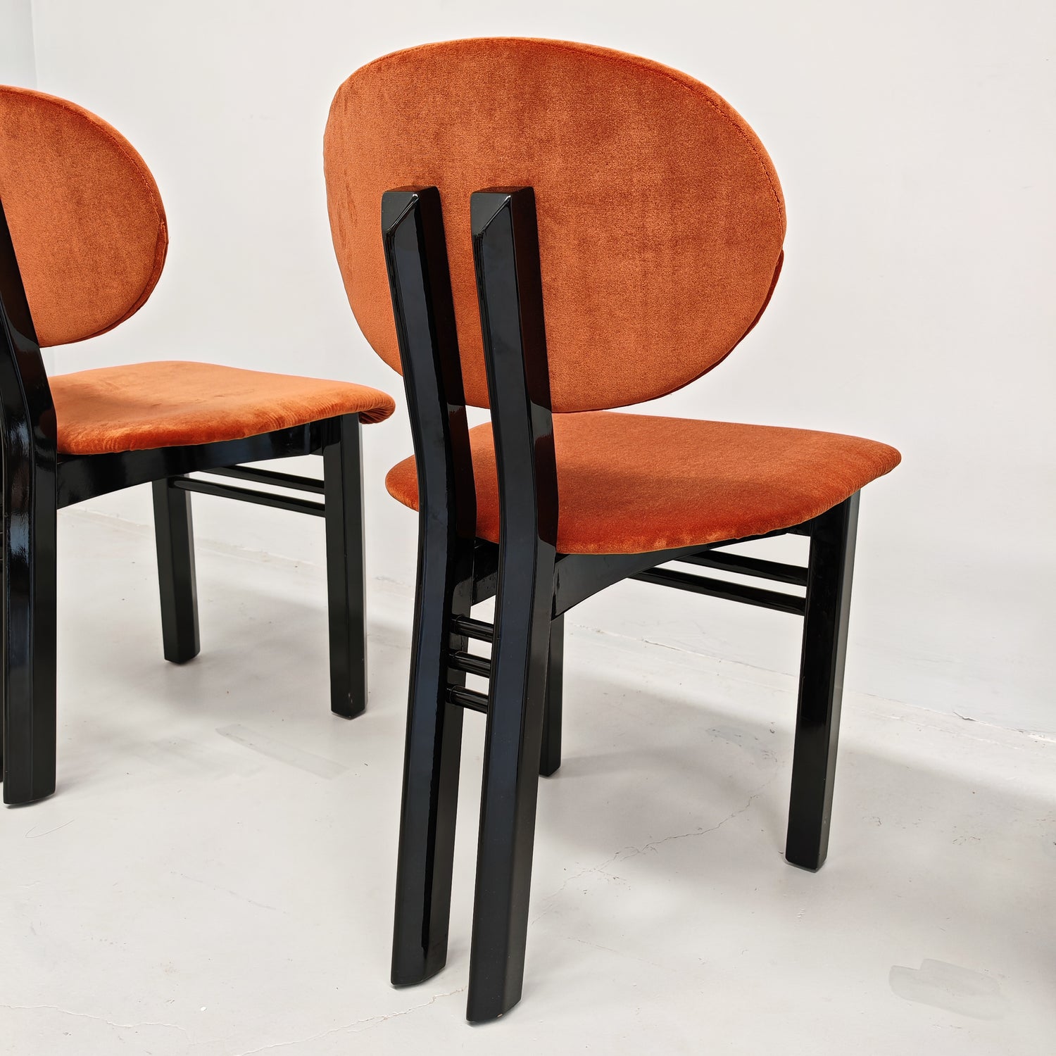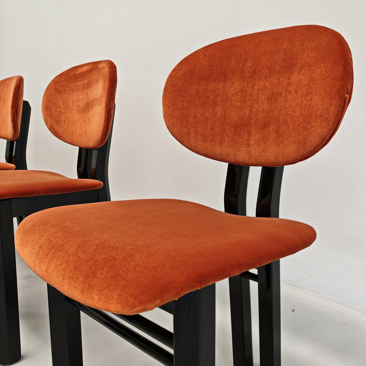La sedia MED è stata realizzata nel 1983 da Giotto Stoppino e Lodovico Acerbis per Acerbis. Si caratterizza per il suo contrasto tra curve e linearità, come la particolare sezione delle gambe, che ricorda il Flatiron Building di Manhattan, e le rotondità di schienale e seduta realizzate in multistrato curvato. Nel 2022 Acerbis le ha riproposte nella collezione Remasters, questo set invece appartiene alla produzione originale anni 80 e si distingue per la laccatura in poliestere nero lucido rispetto alle finiture opache delle produzioni recenti. Il rivestimento e l'imbottitura sono stati rinnovati applicando spugne nuove e un velluto top quality color ruggine.