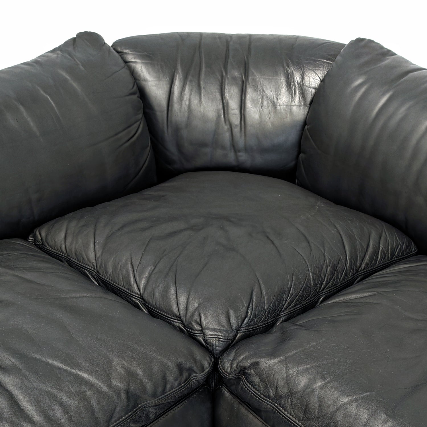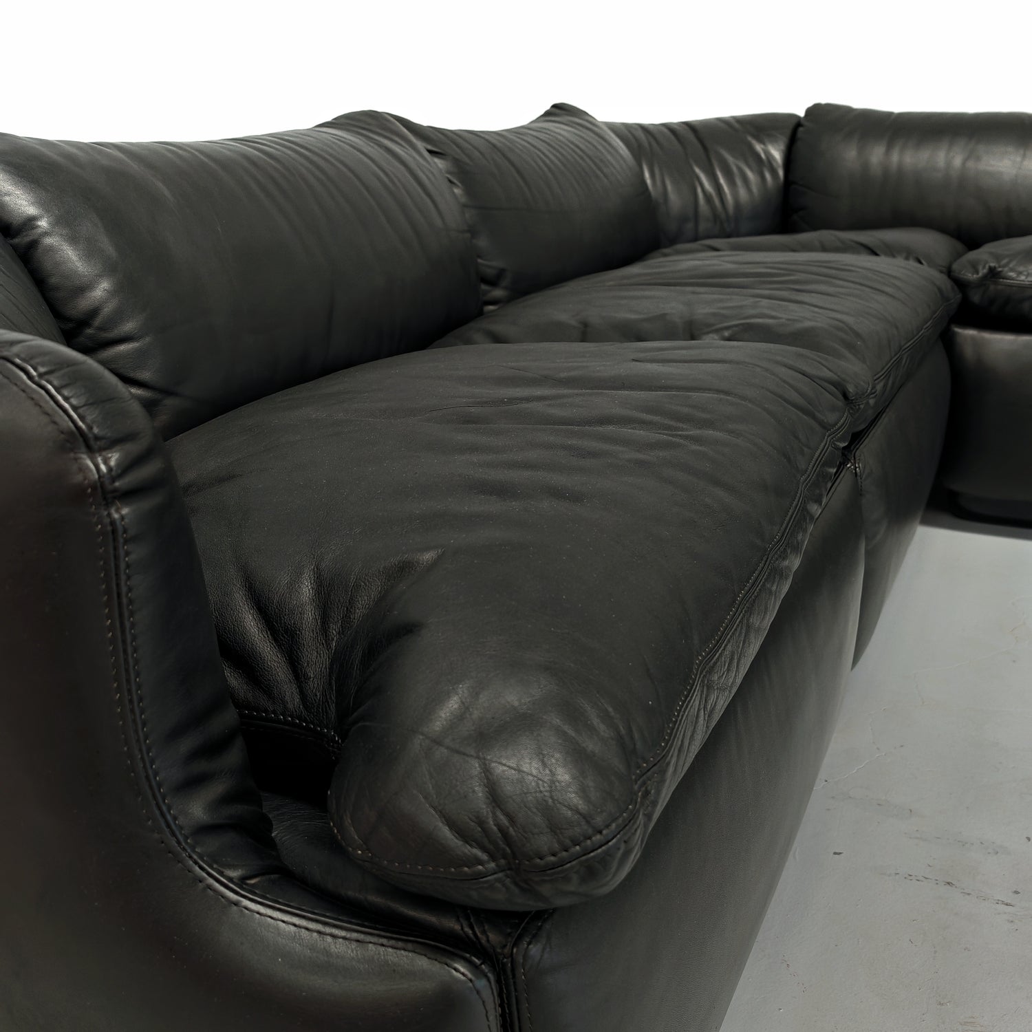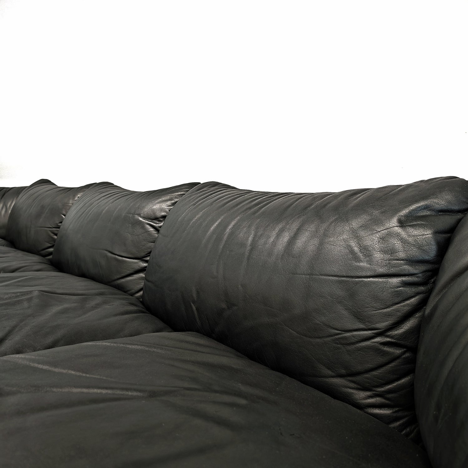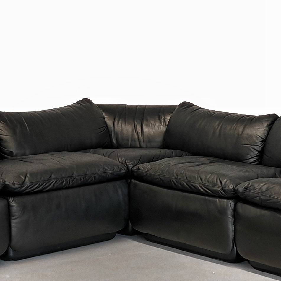 Splendido Divano angolare modulare modello Confidential in pelle nera . il Divano è composto da 4 pezzi: due moduli da due sedute un modulo singolo e un angolare. Confidential , con il suo design insolito, è un simbolo di comfort ed eleganza, con sedute e schienali sfalsati che formano un particolare disegno scultoreo nel retro del divano.