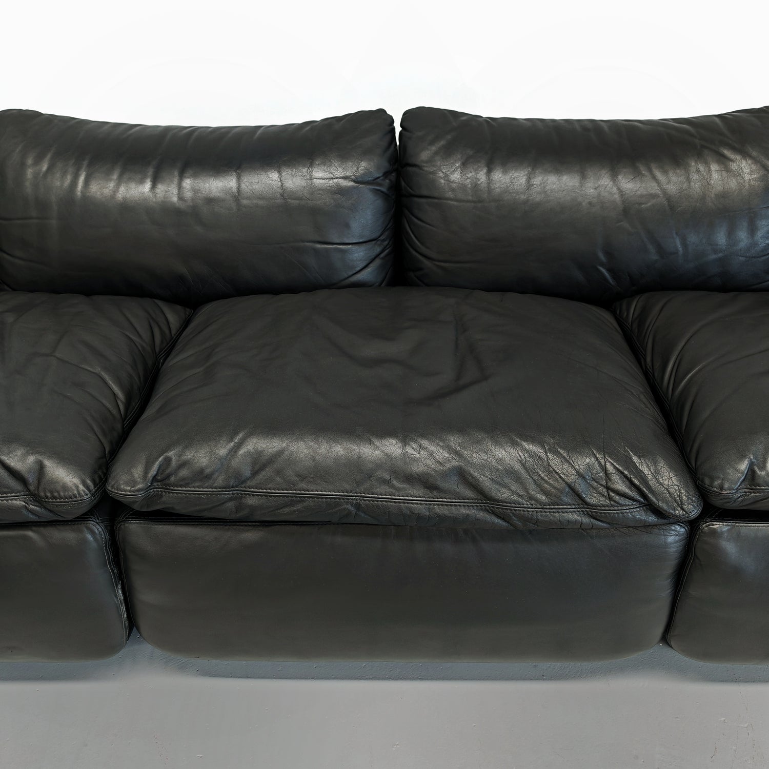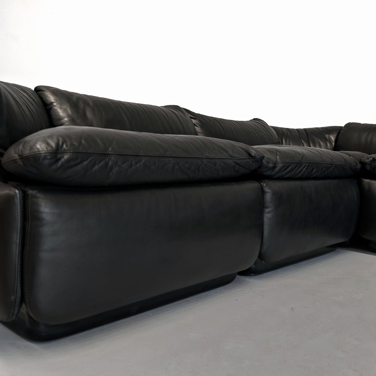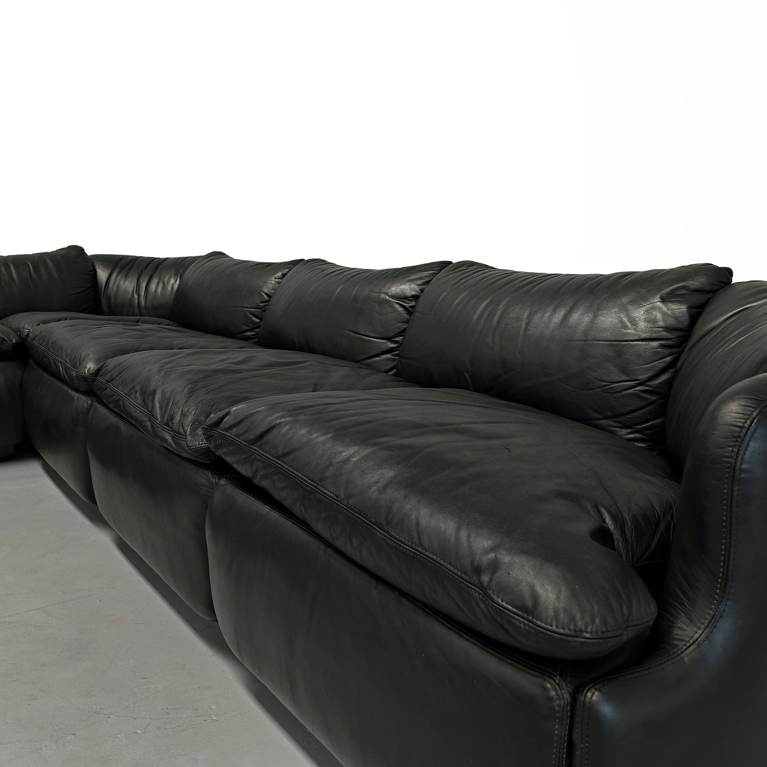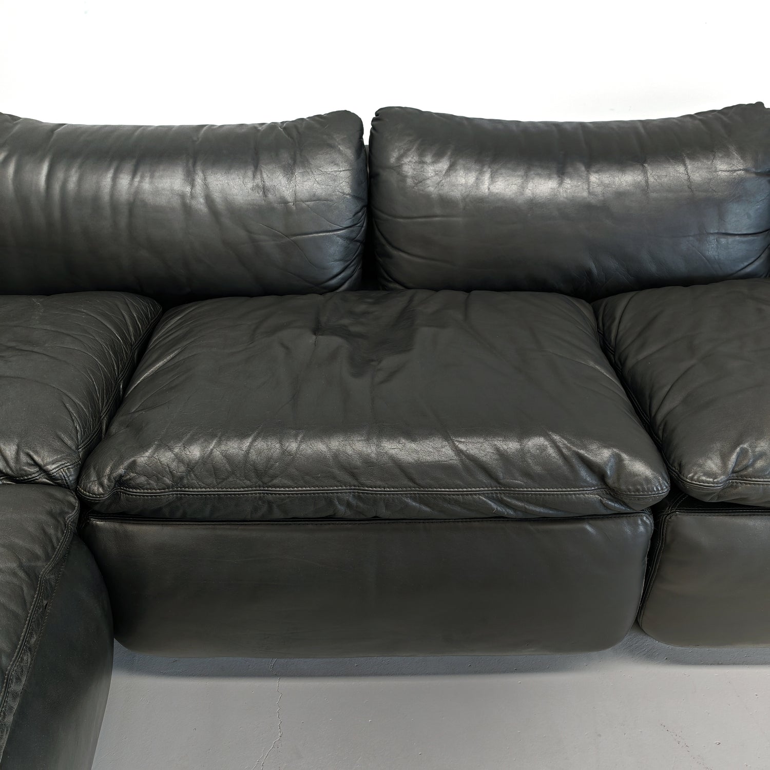 Splendido Divano angolare modulare modello Confidential in pelle nera . il Divano è composto da 4 pezzi: due moduli da due sedute un modulo singolo e un angolare. Confidential , con il suo design insolito, è un simbolo di comfort ed eleganza, con sedute e schienali sfalsati che formano un particolare disegno scultoreo nel retro del divano.