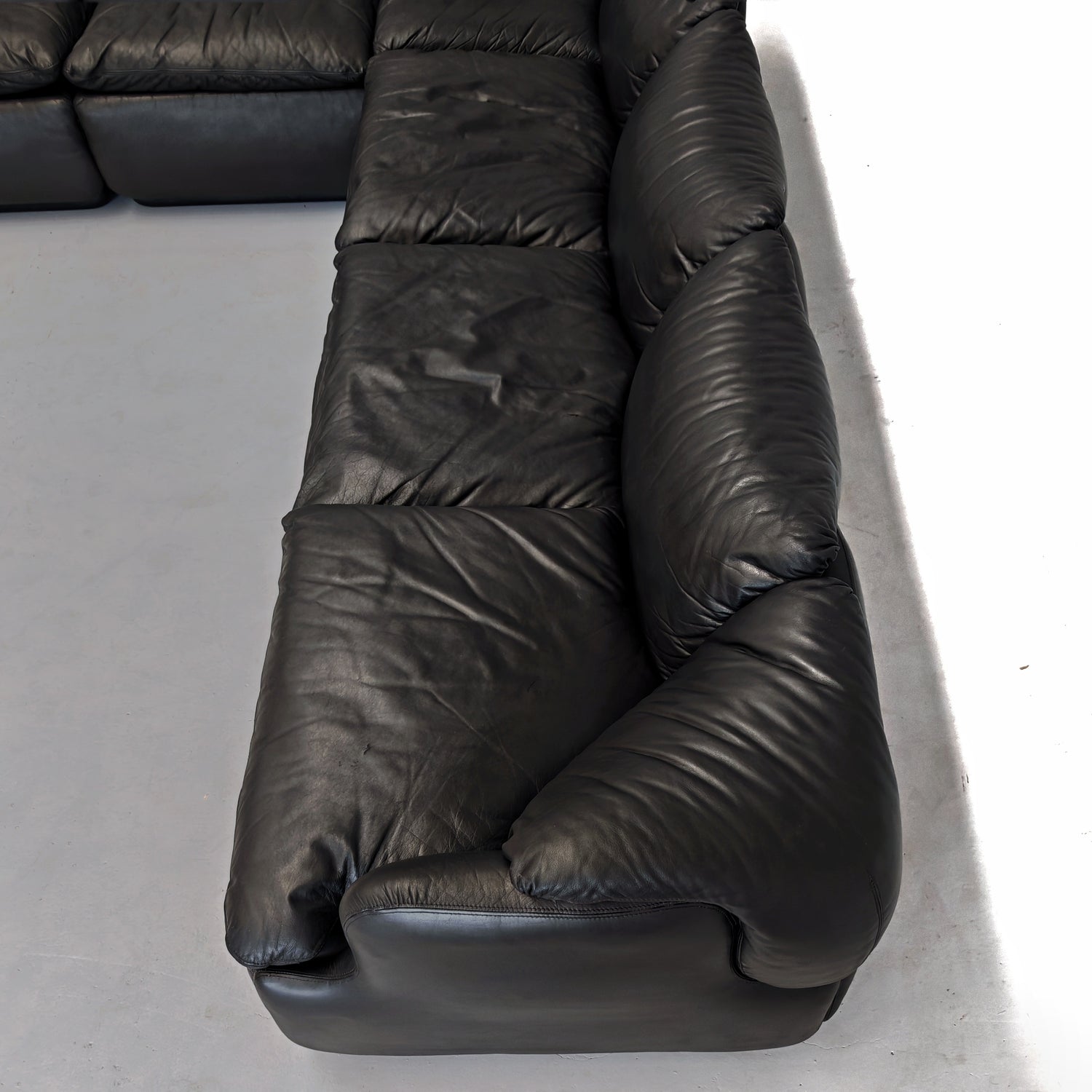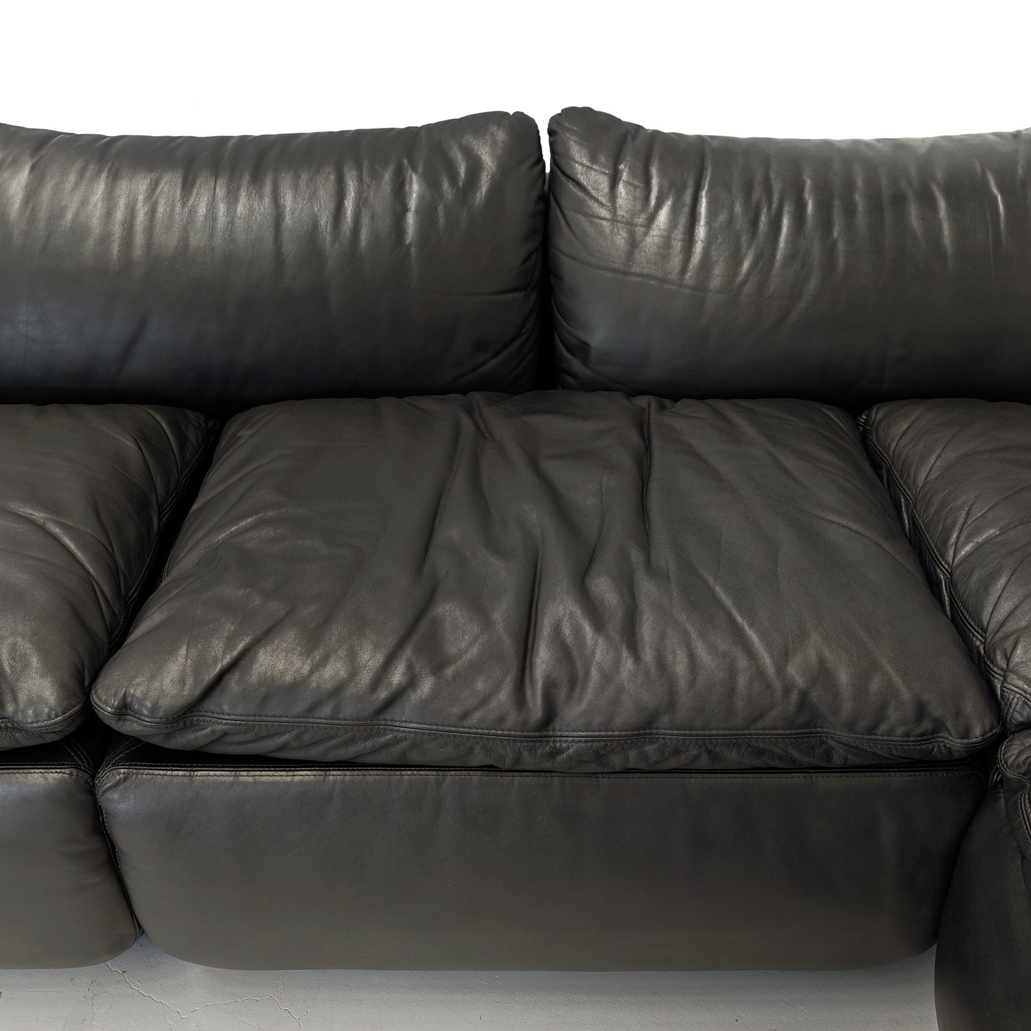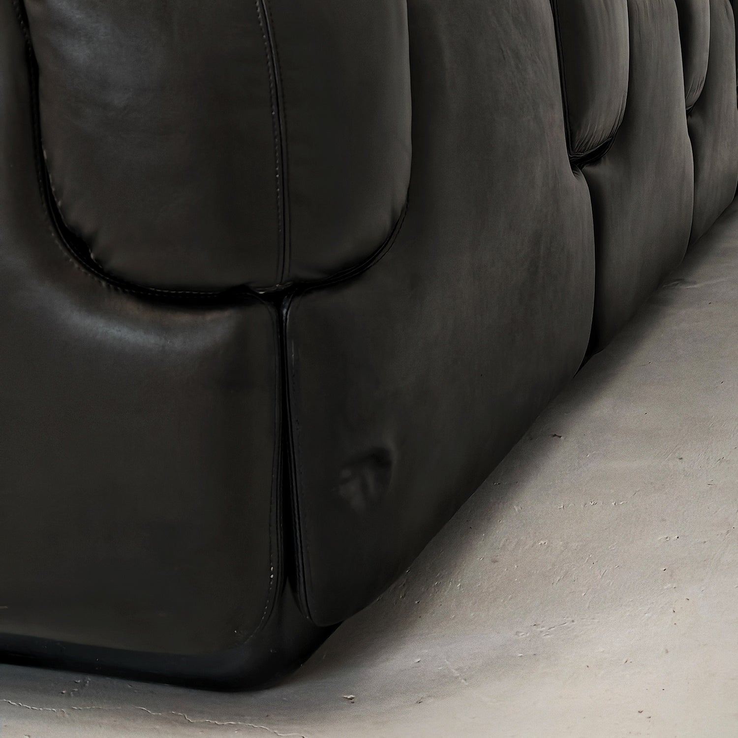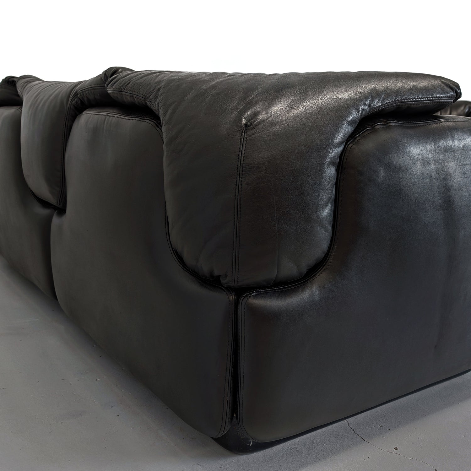 Splendido Divano angolare modulare modello Confidential in pelle nera . il Divano è composto da 4 pezzi: due moduli da due sedute un modulo singolo e un angolare. Confidential , con il suo design insolito, è un simbolo di comfort ed eleganza, con sedute e schienali sfalsati che formano un particolare disegno scultoreo nel retro del divano.