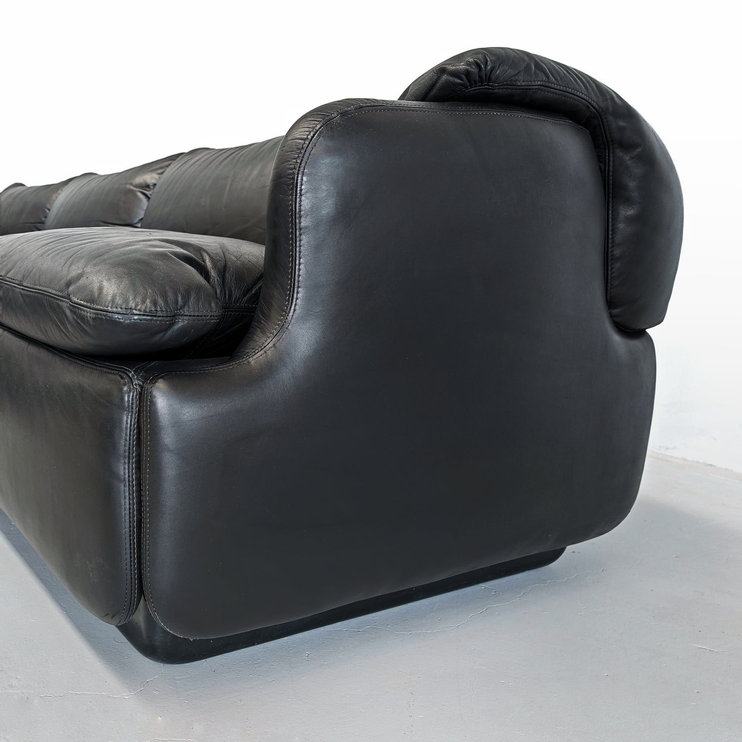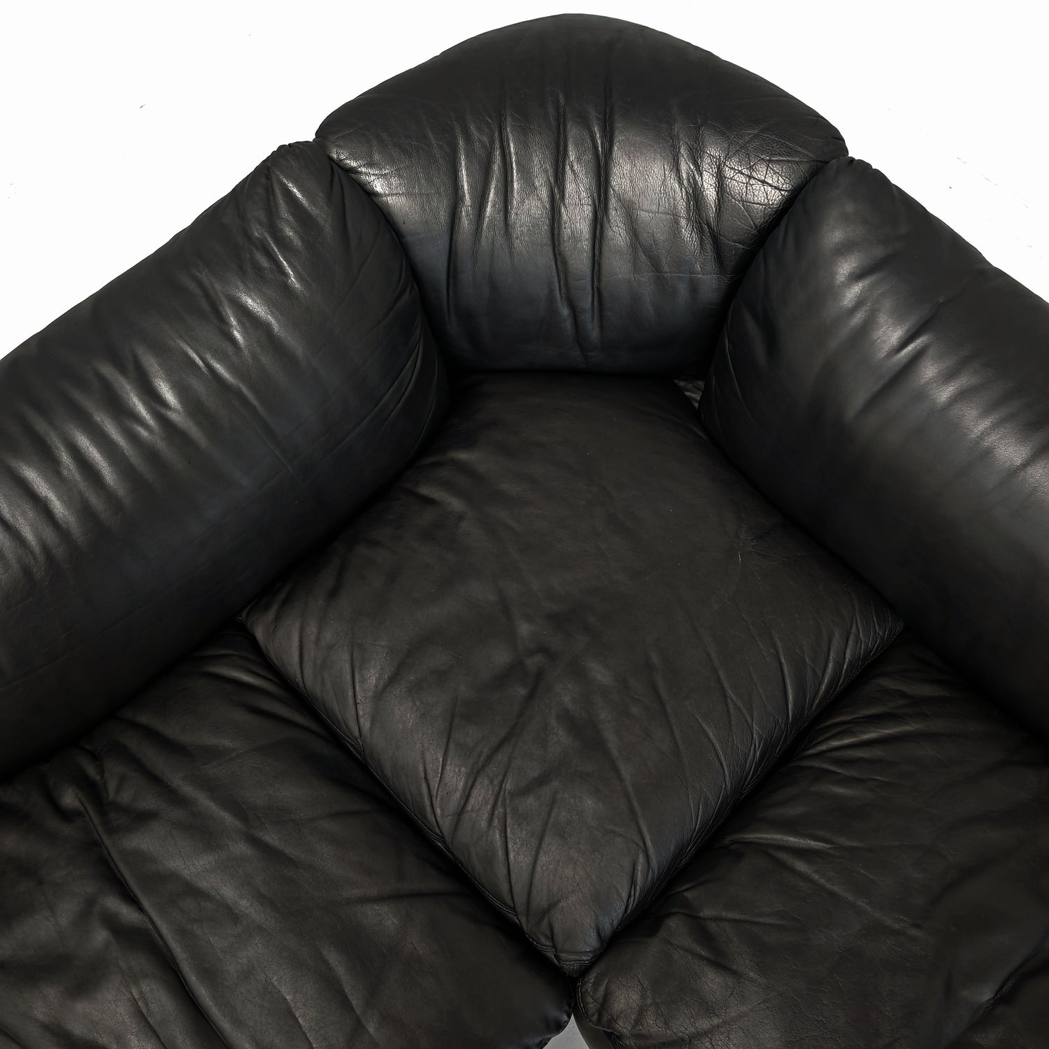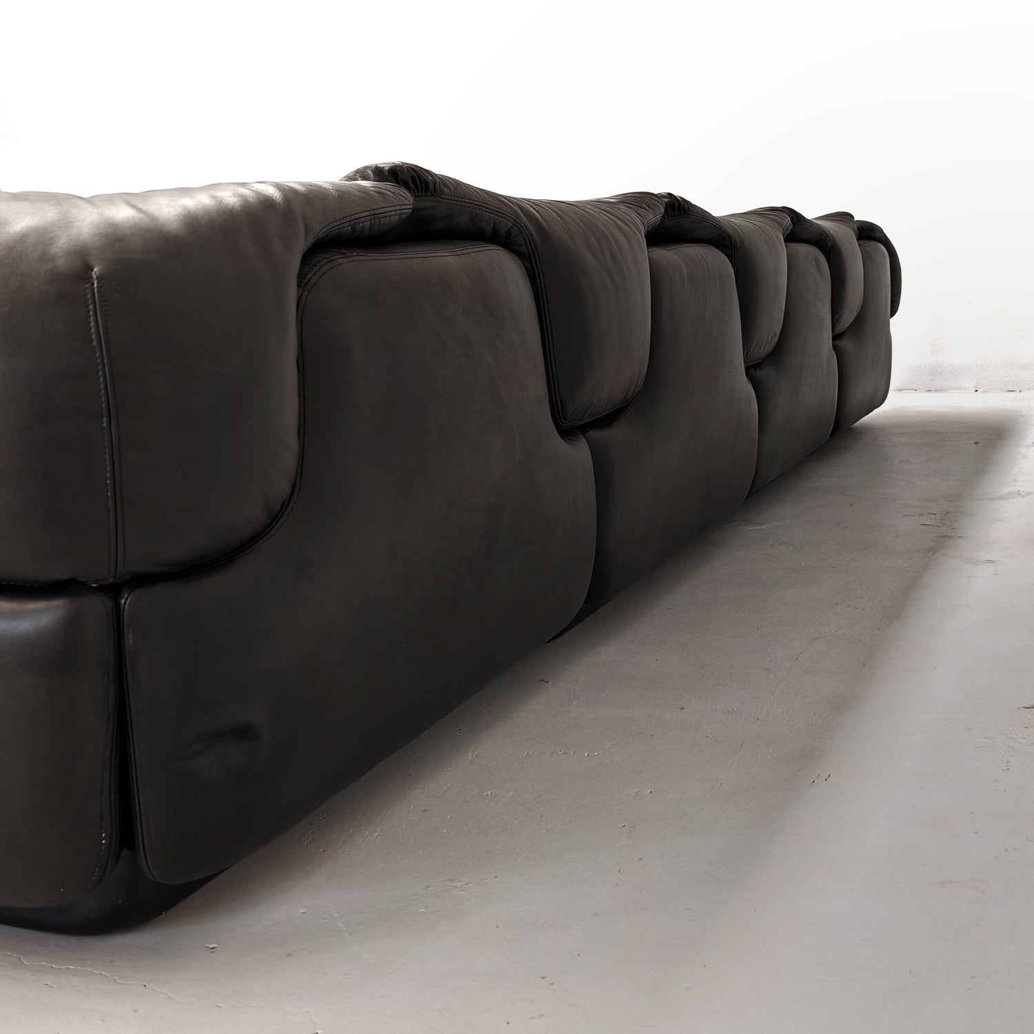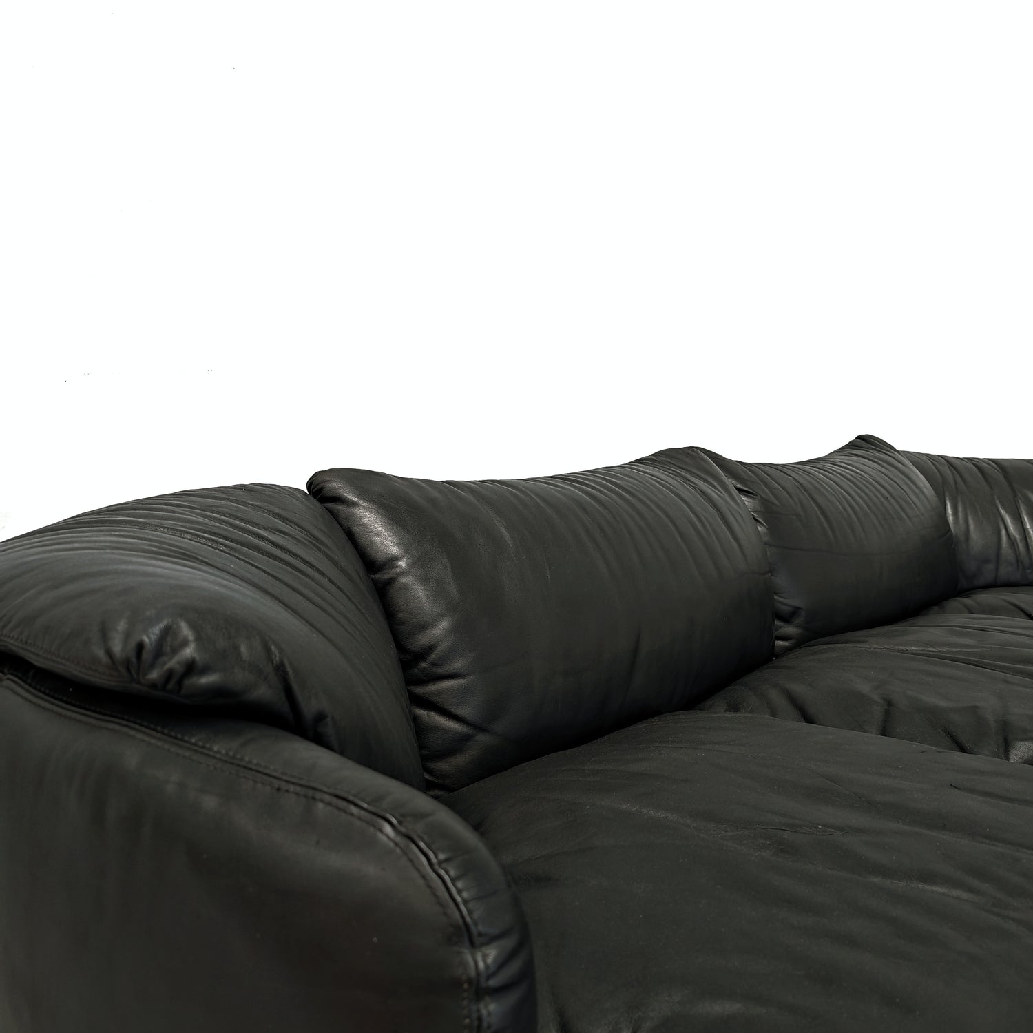 Splendido Divano angolare modulare modello Confidential in pelle nera . il Divano è composto da 4 pezzi: due moduli da due sedute un modulo singolo e un angolare. Confidential , con il suo design insolito, è un simbolo di comfort ed eleganza, con sedute e schienali sfalsati che formano un particolare disegno scultoreo nel retro del divano.