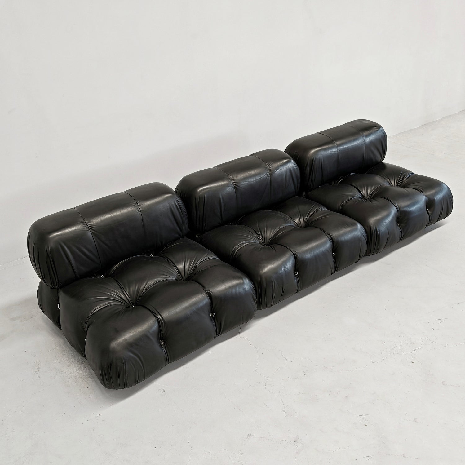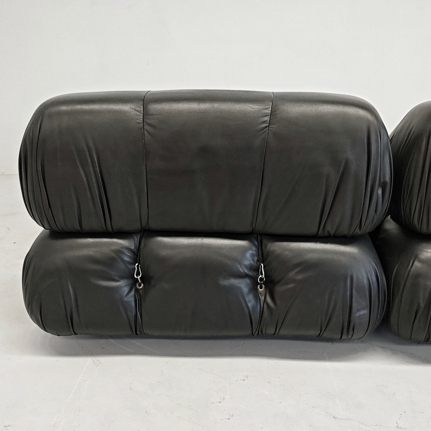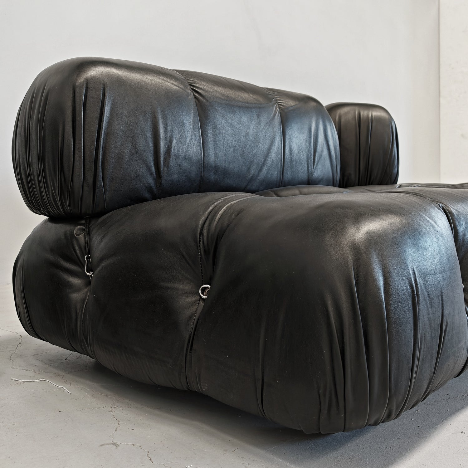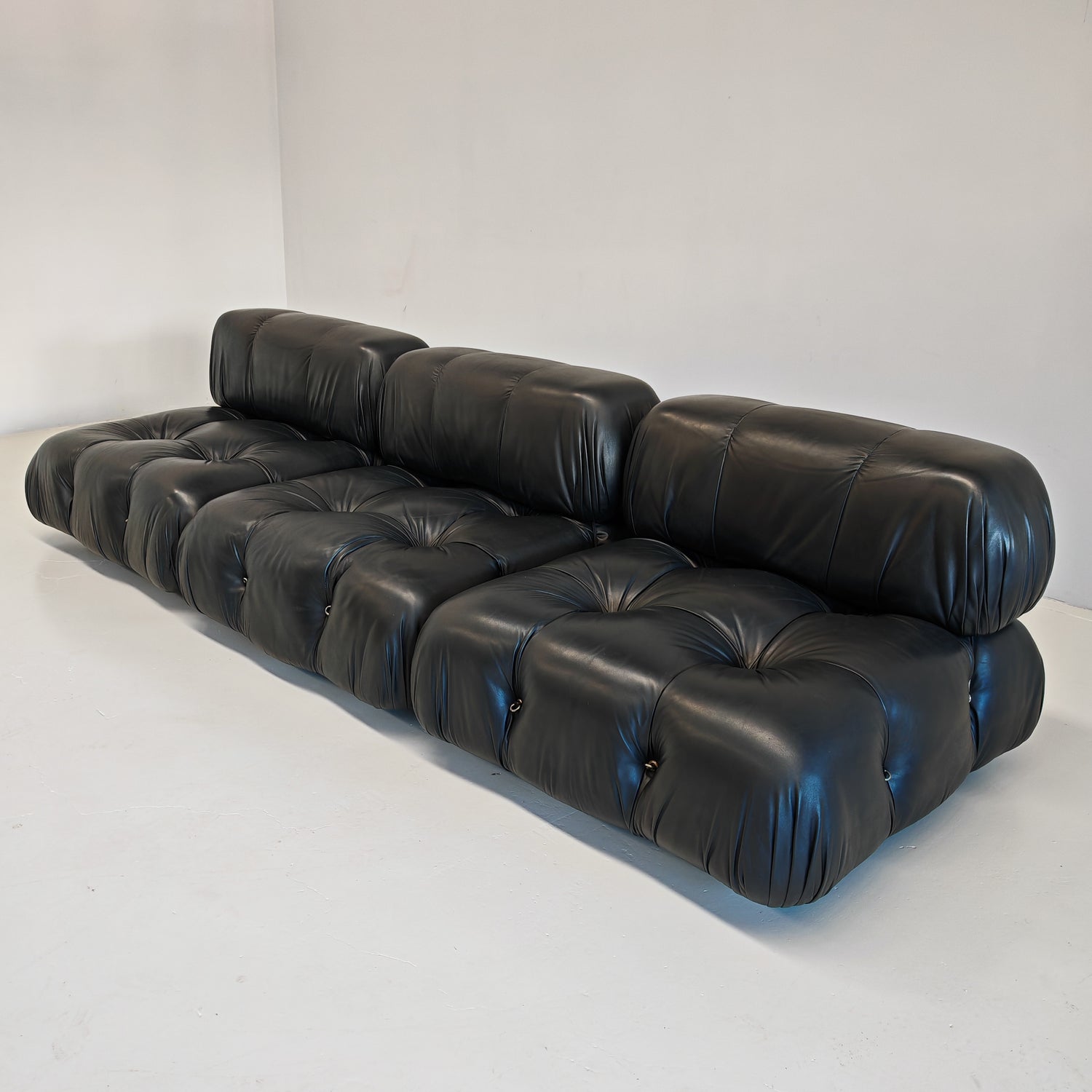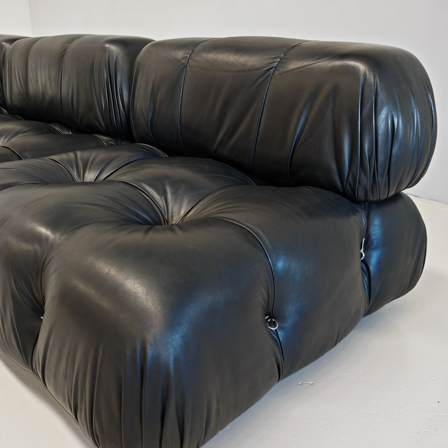 Splendido Divano modulare 3 posti modello Camaleonda disegnato nel 1970 da Mario Bellini per C&B (poi diventata B&B). Essendo marchiato C&B è appartenente alla prima serie per cui ha anche un valore collezionistico. La pelle nera conferisce eleganza e l'imbottitura generosa dà volume, accoglienza e un forte impatto visivo.