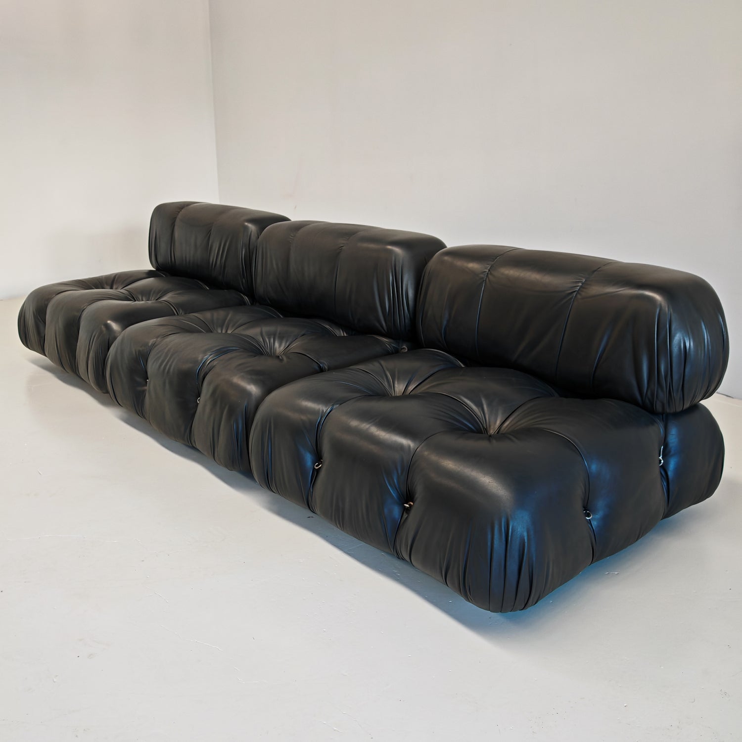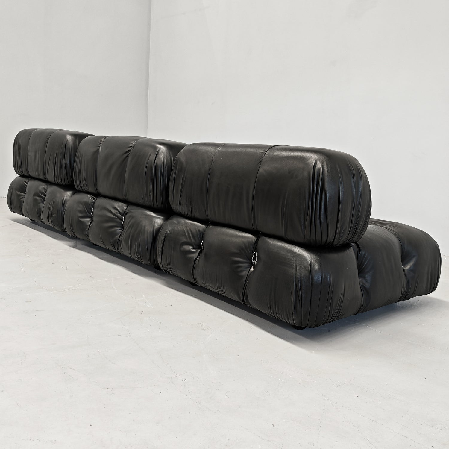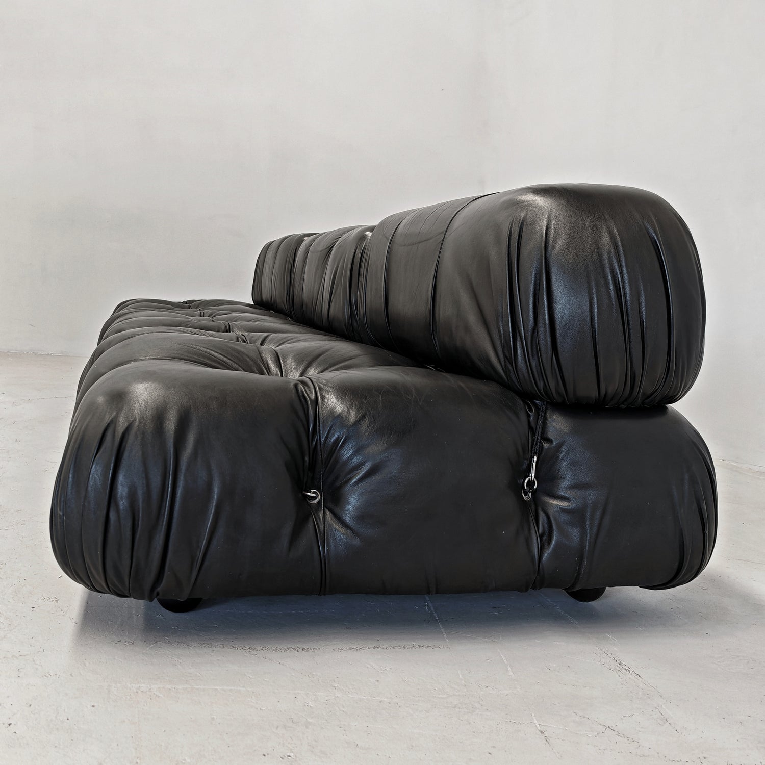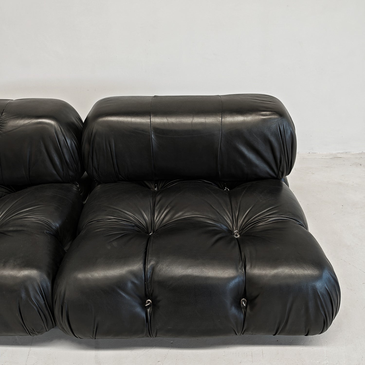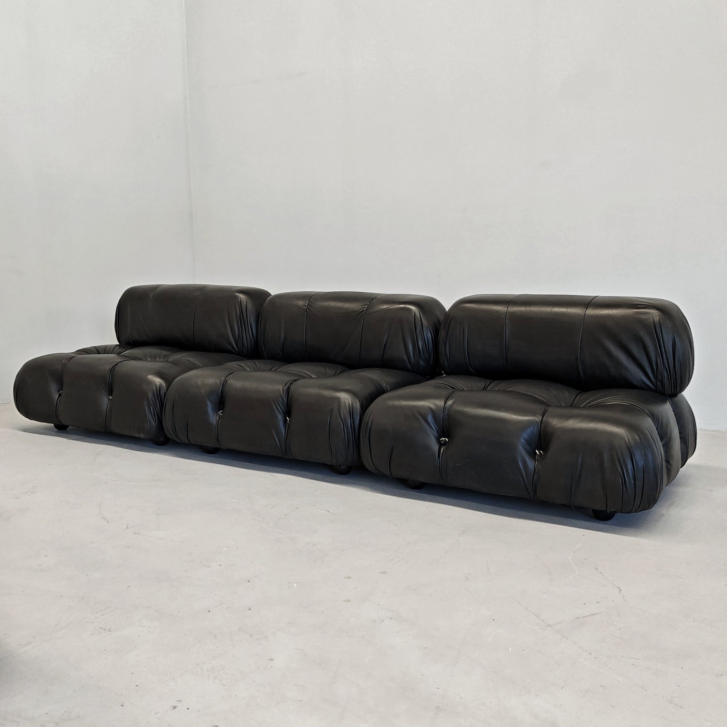 Splendido Divano modulare 3 posti modello Camaleonda disegnato nel 1970 da Mario Bellini per C&B (poi diventata B&B). Essendo marchiato C&B è appartenente alla prima serie per cui ha anche un valore collezionistico. La pelle nera conferisce eleganza e l'imbottitura generosa dà volume, accoglienza e un forte impatto visivo.