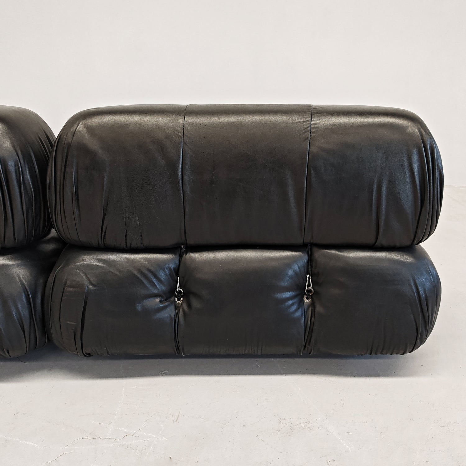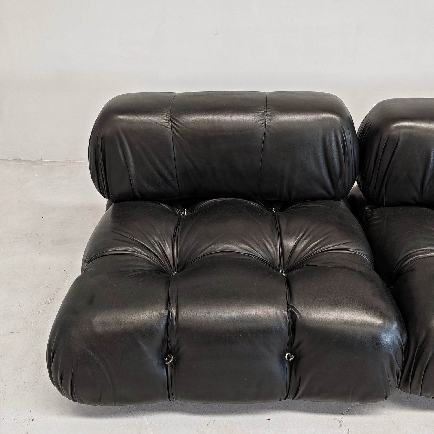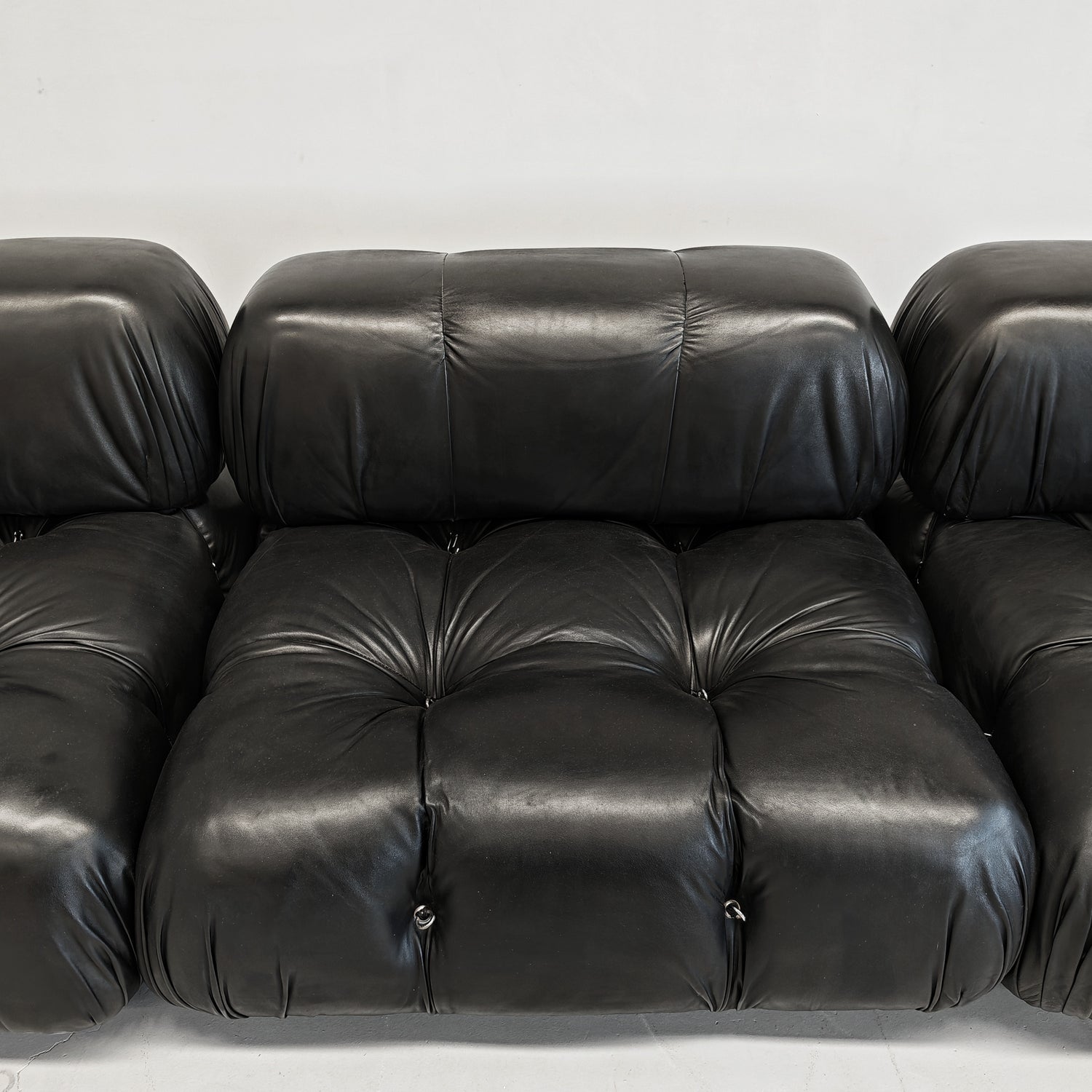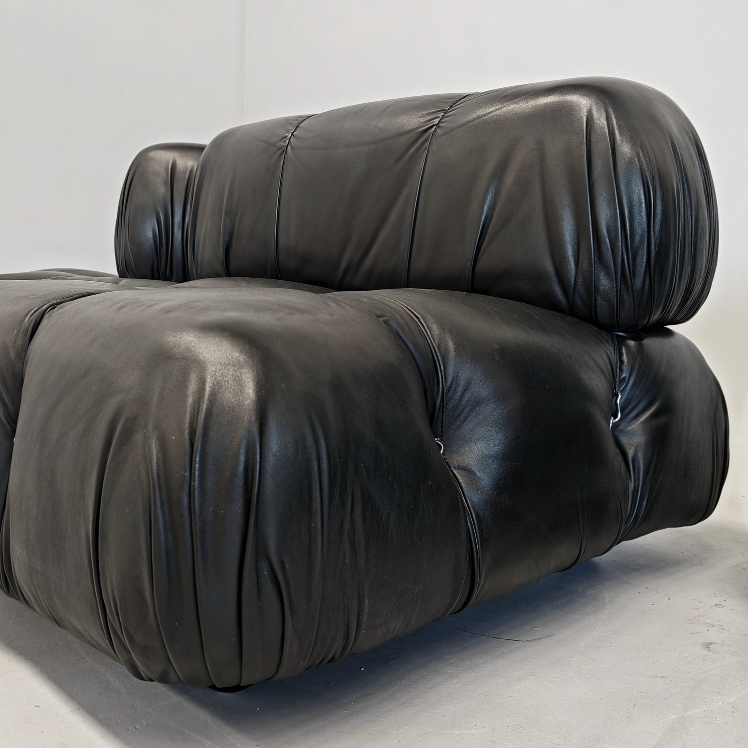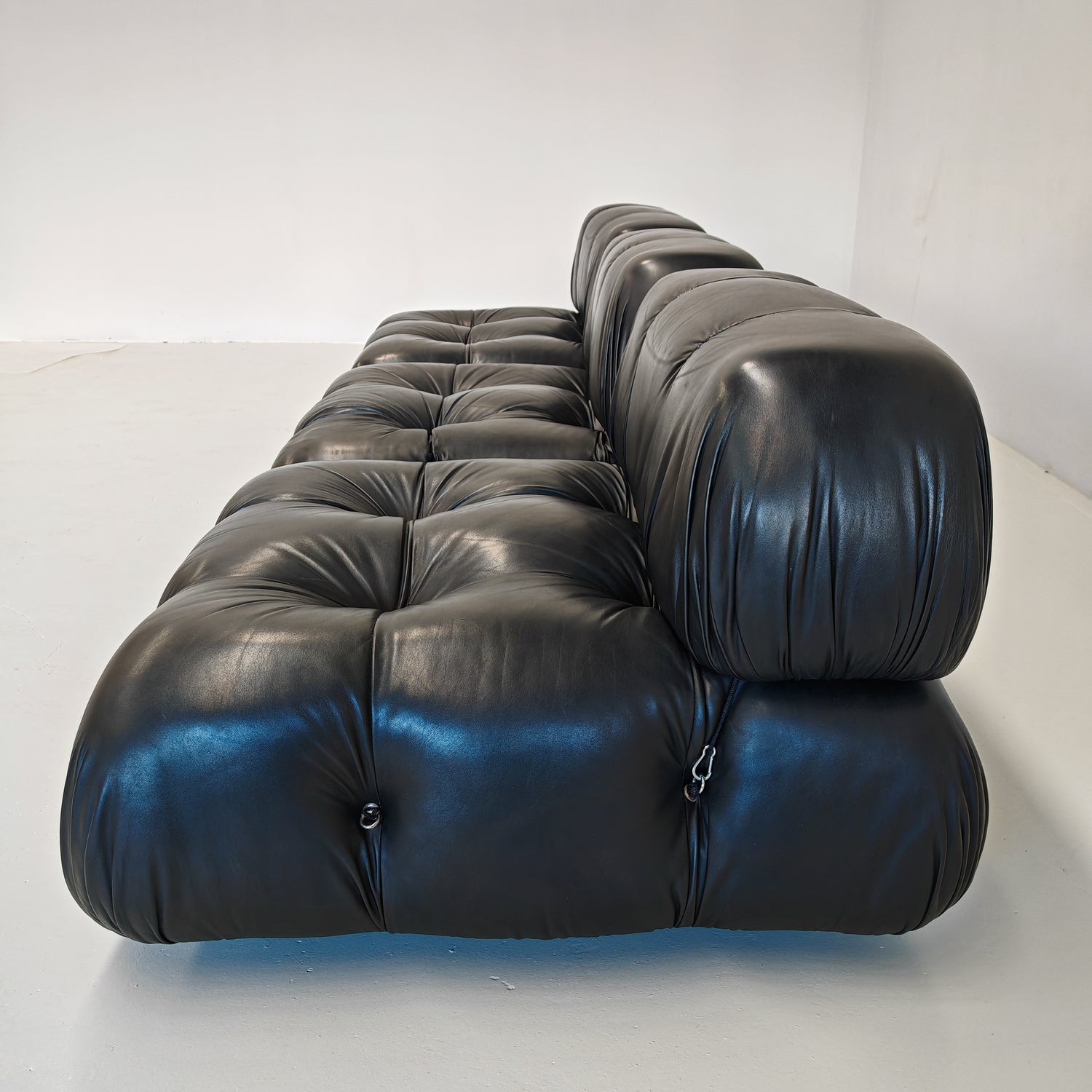 Splendido Divano modulare 3 posti modello Camaleonda disegnato nel 1970 da Mario Bellini per C&B (poi diventata B&B). Essendo marchiato C&B è appartenente alla prima serie per cui ha anche un valore collezionistico. La pelle nera conferisce eleganza e l'imbottitura generosa dà volume, accoglienza e un forte impatto visivo.