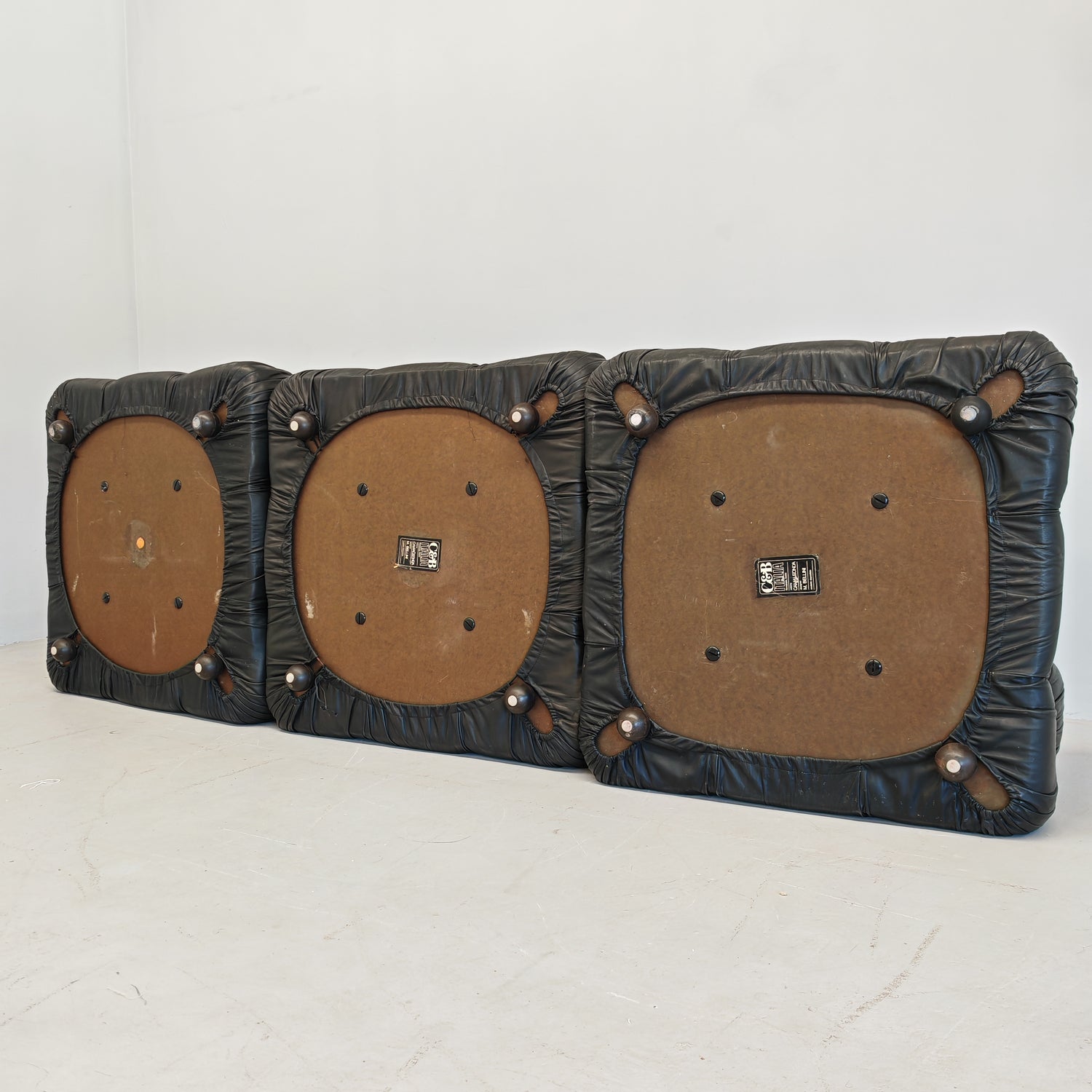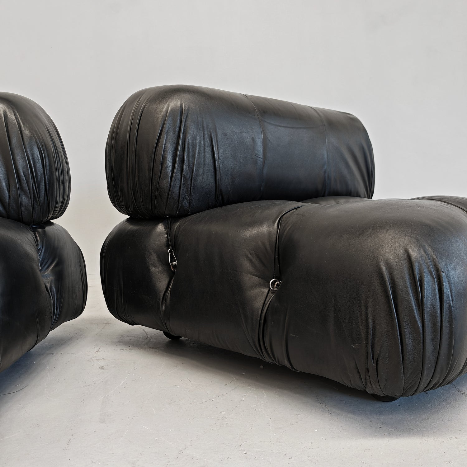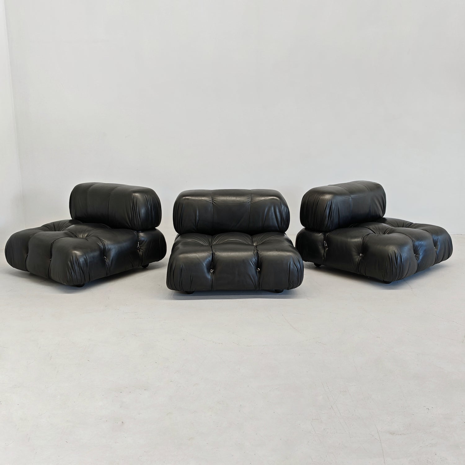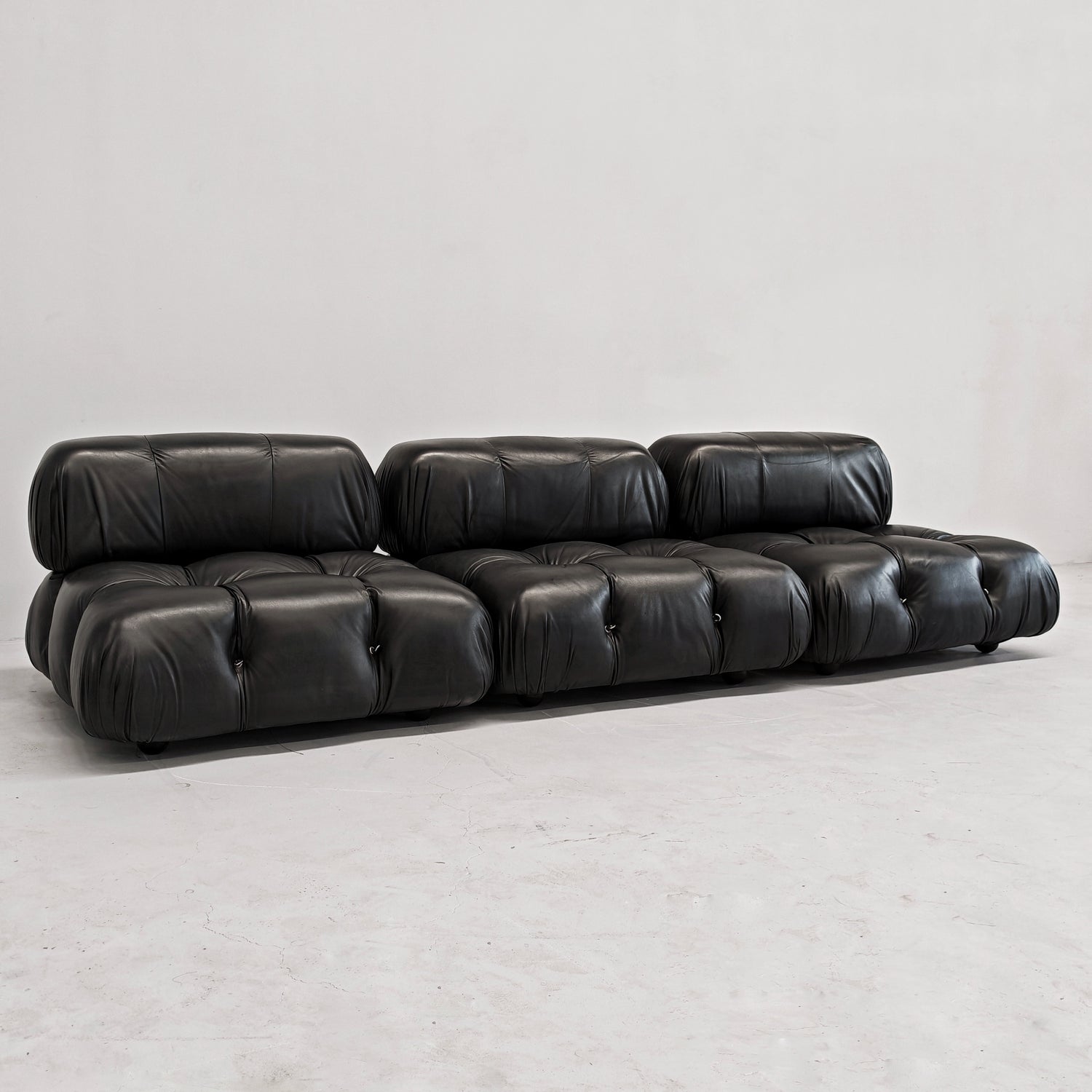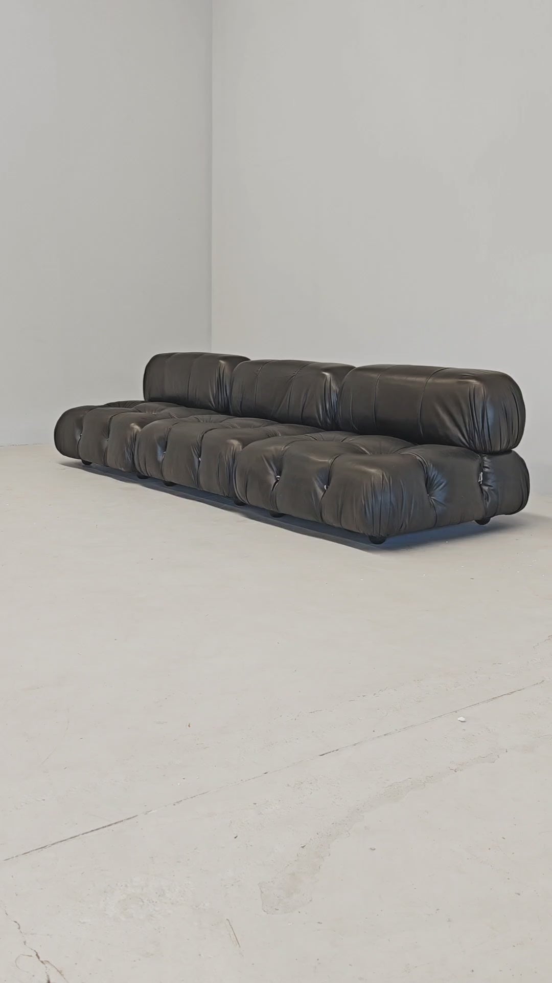 Splendido Divano modulare 3 posti modello Camaleonda disegnato nel 1970 da Mario Bellini per C&B (poi diventata B&B). Essendo marchiato C&B è appartenente alla prima serie per cui ha anche un valore collezionistico. La pelle nera conferisce eleganza e l'imbottitura generosa dà volume, accoglienza e un forte impatto visivo.
