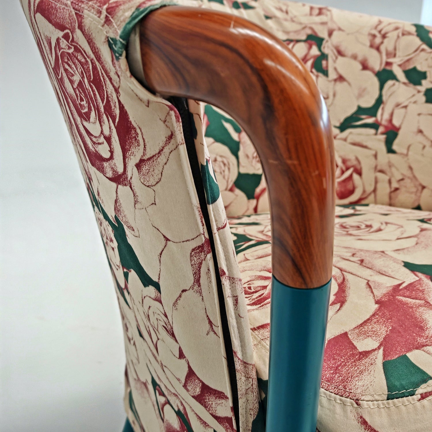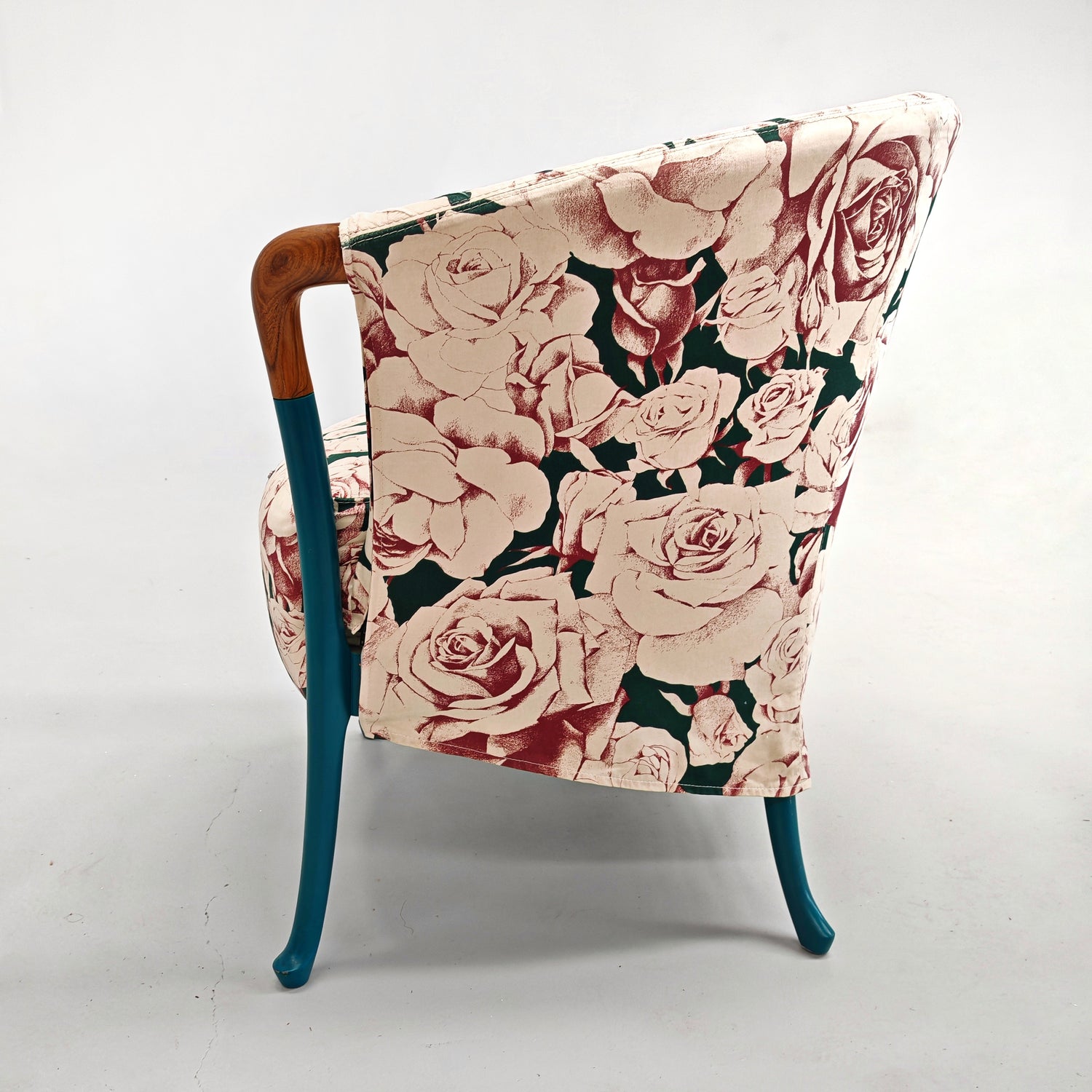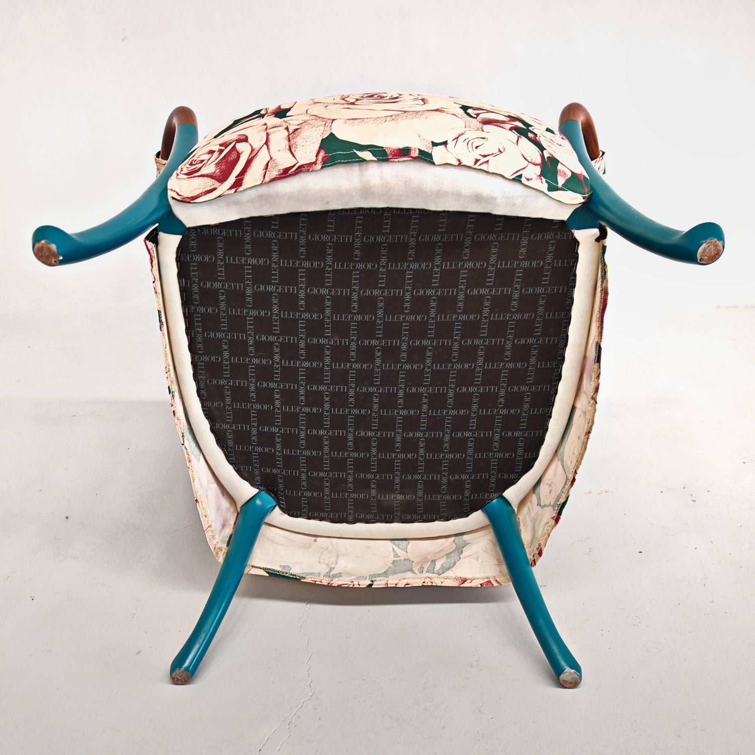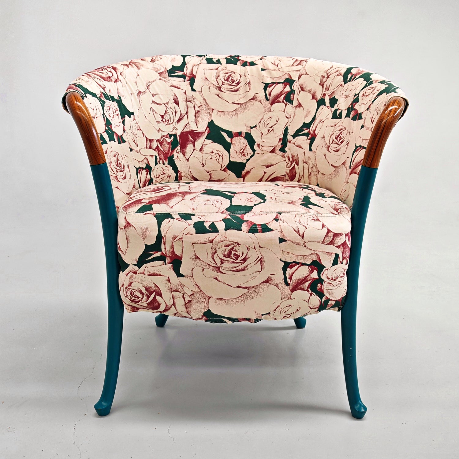 Poltrona Giorgetti modello Progetti, disegnata negli anni 80 da Umberto Asnago per Giorgetti. La poltrona "Progetti" ha un'immagine fortemente riconoscibile, che, grazie al suo design innovativo e fresco, è diventata un'icona per Giorgetti. La struttura è in faggio massello, con gambe laccate color petrolio. I braccioli sono in Pau ferro lucidato, un legno pregiato e indeformabile che rappresenta uno dei segni estetici caratteristici di questa poltrona. L'imbottitura della seduta e dello schienale è realizzata in poliuretano espanso indeformabile a quote differenziate e fibra. Il rivestimento è in tessuto completamente sfoderabile in diverse tonalità di colore con un tema floreale molto raro.