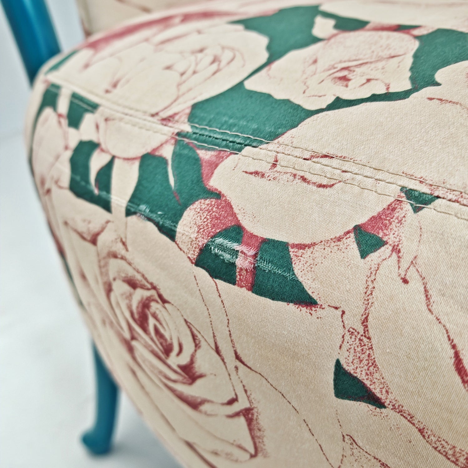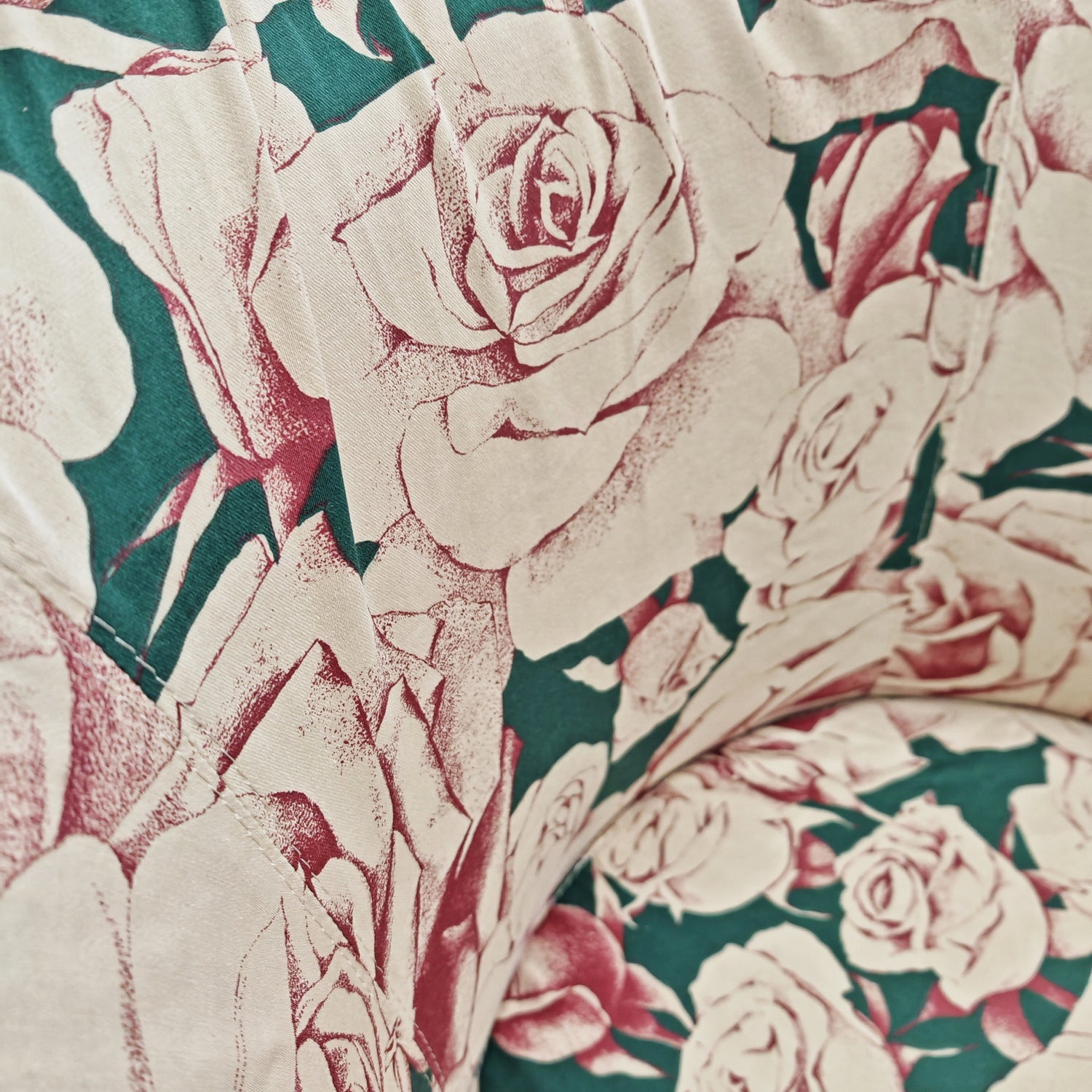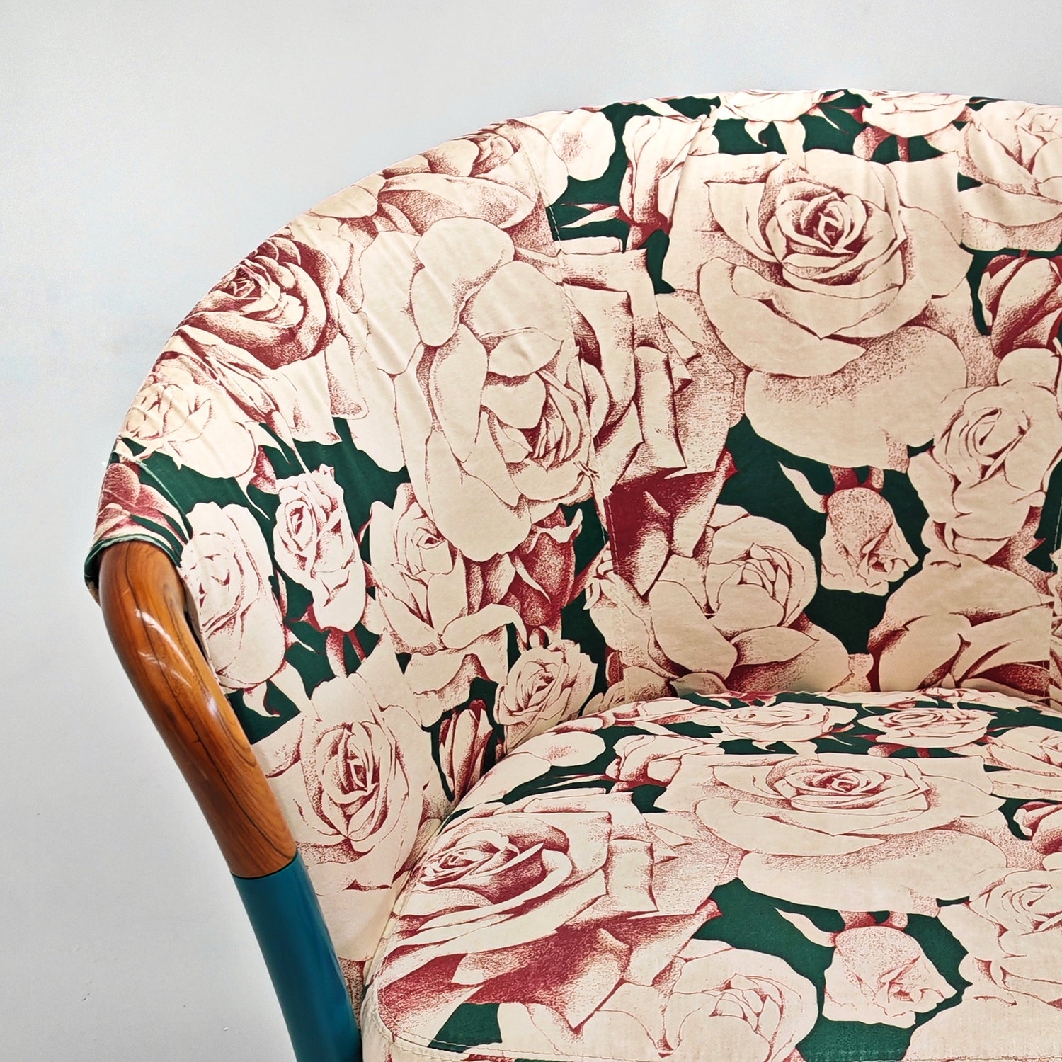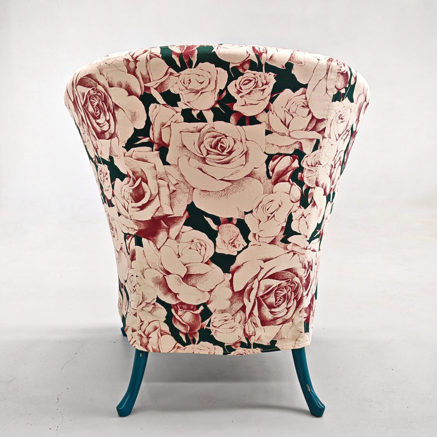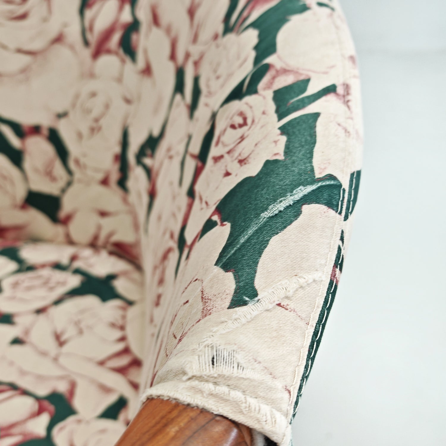 Poltrona Giorgetti modello Progetti, disegnata negli anni 80 da Umberto Asnago per Giorgetti. La poltrona "Progetti" ha un'immagine fortemente riconoscibile, che, grazie al suo design innovativo e fresco, è diventata un'icona per Giorgetti. La struttura è in faggio massello, con gambe laccate color petrolio. I braccioli sono in Pau ferro lucidato, un legno pregiato e indeformabile che rappresenta uno dei segni estetici caratteristici di questa poltrona. L'imbottitura della seduta e dello schienale è realizzata in poliuretano espanso indeformabile a quote differenziate e fibra. Il rivestimento è in tessuto completamente sfoderabile in diverse tonalità di colore con un tema floreale molto raro.